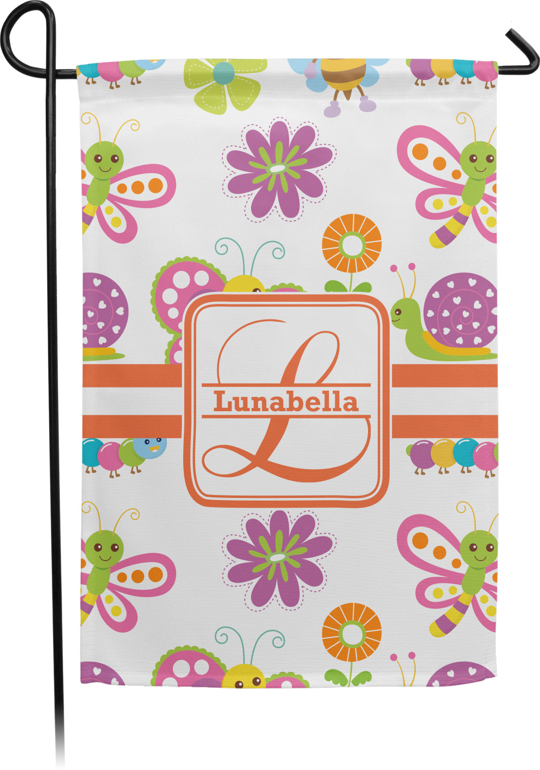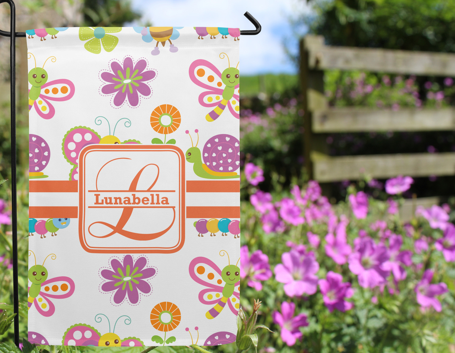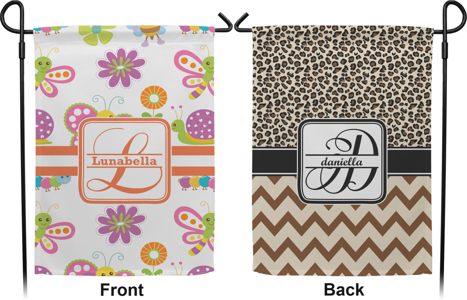 These custom garden flags are made of a durable, double-ply, polyester weave, allowing them to withstand the elements year round. The small flags measure at approximately 12 by 18 inches. The large flags measure out to 28 by 37 inches. You can order these decorative flags with your customization printed on the front only, or the front and back.
