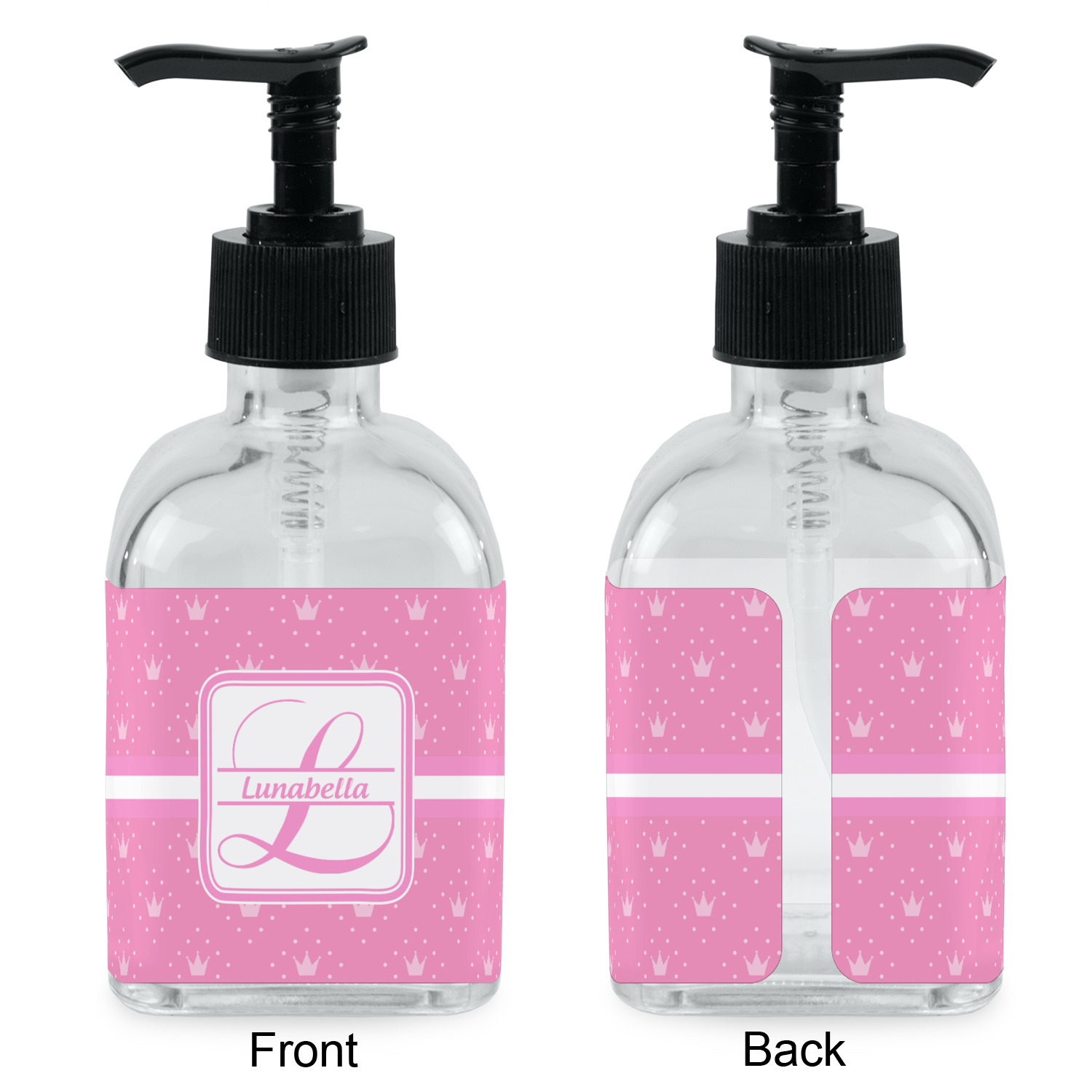 Crafted from a high-quality glass, these soap dispensers and lotion dispensers are durable and robust, while still looking elegant. They are sold with black pumps. Each soap dispenser pump measures at 6.5 by 2.25 inches. On these soap pumps, we display your customized design on a personalized vinyl adhesive on three sides. That way, you can judge how much liquid is in the bottles from the back.