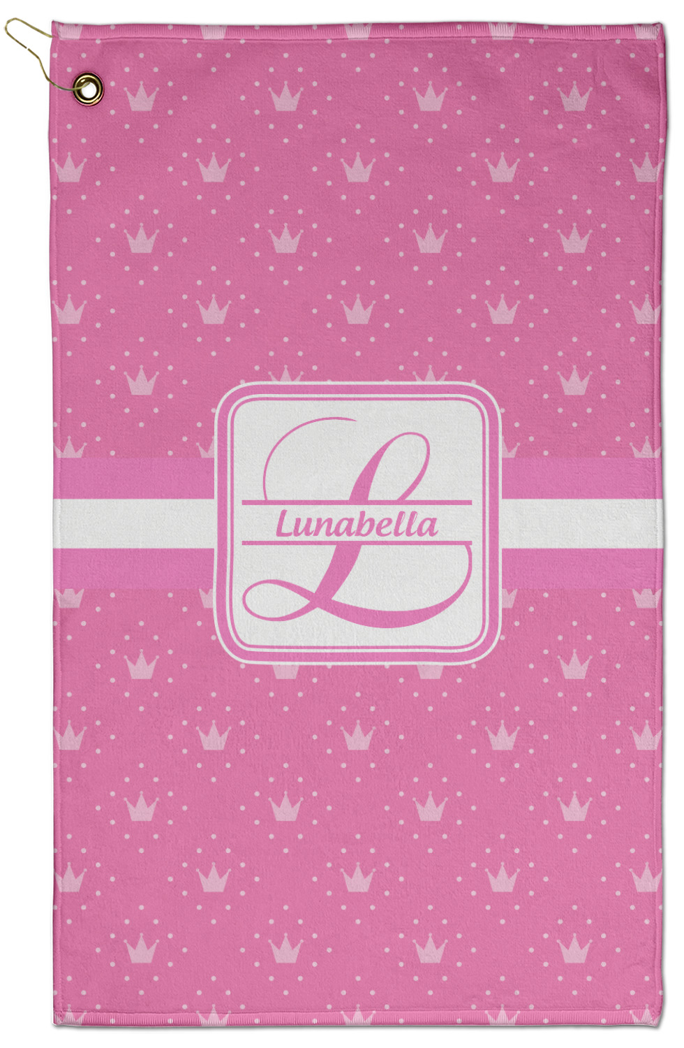 The towel is fully printed / patterned on the front polyester side; and is white on terrycloth cotton backside. The towel has grommet and a pear spring clip in the top left corner. Our golf towels are available in 100s of different prints and patterns.