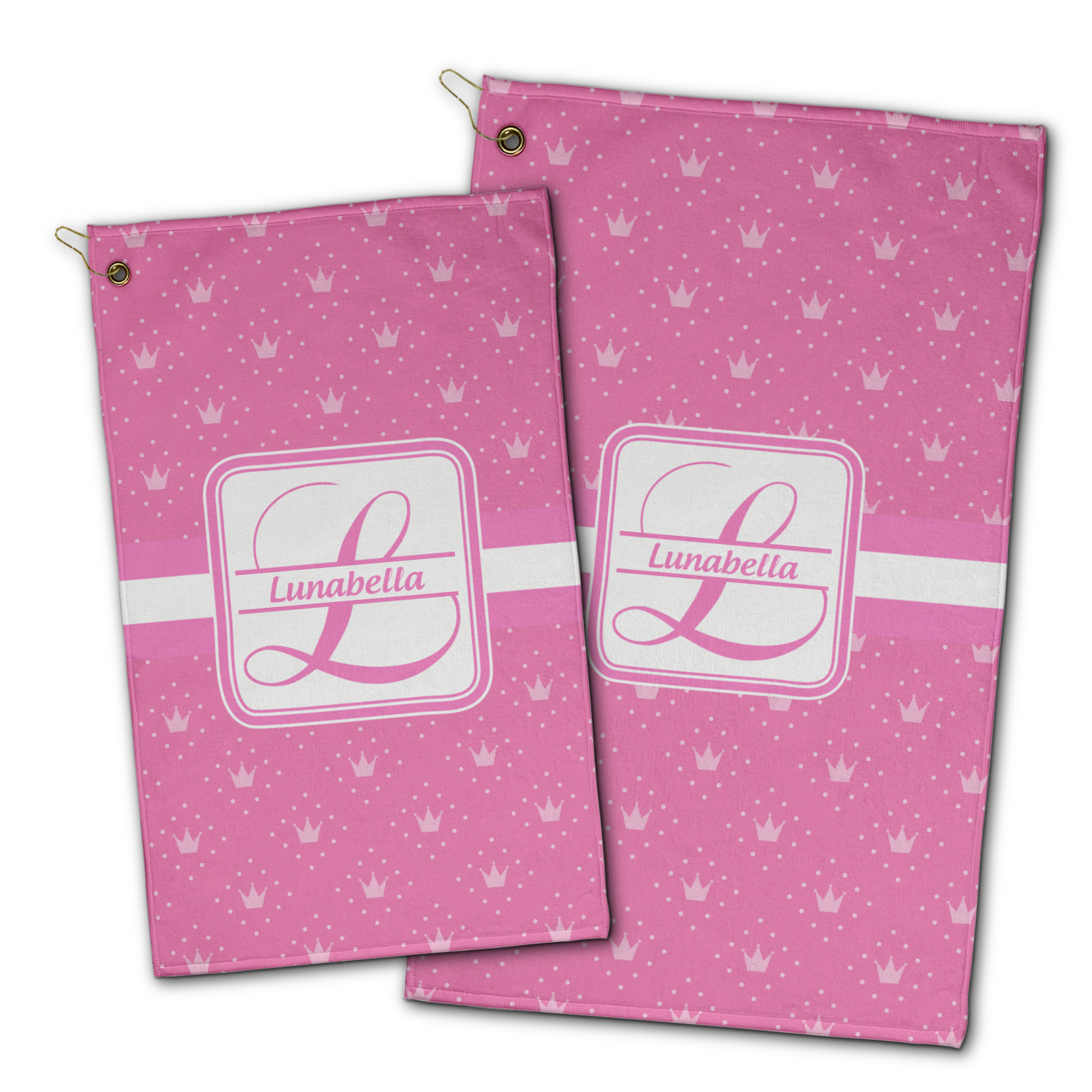 These golf towels are come in 2 sizes: Small: 11"x 18" and Large: 15" x 25" in dimension.