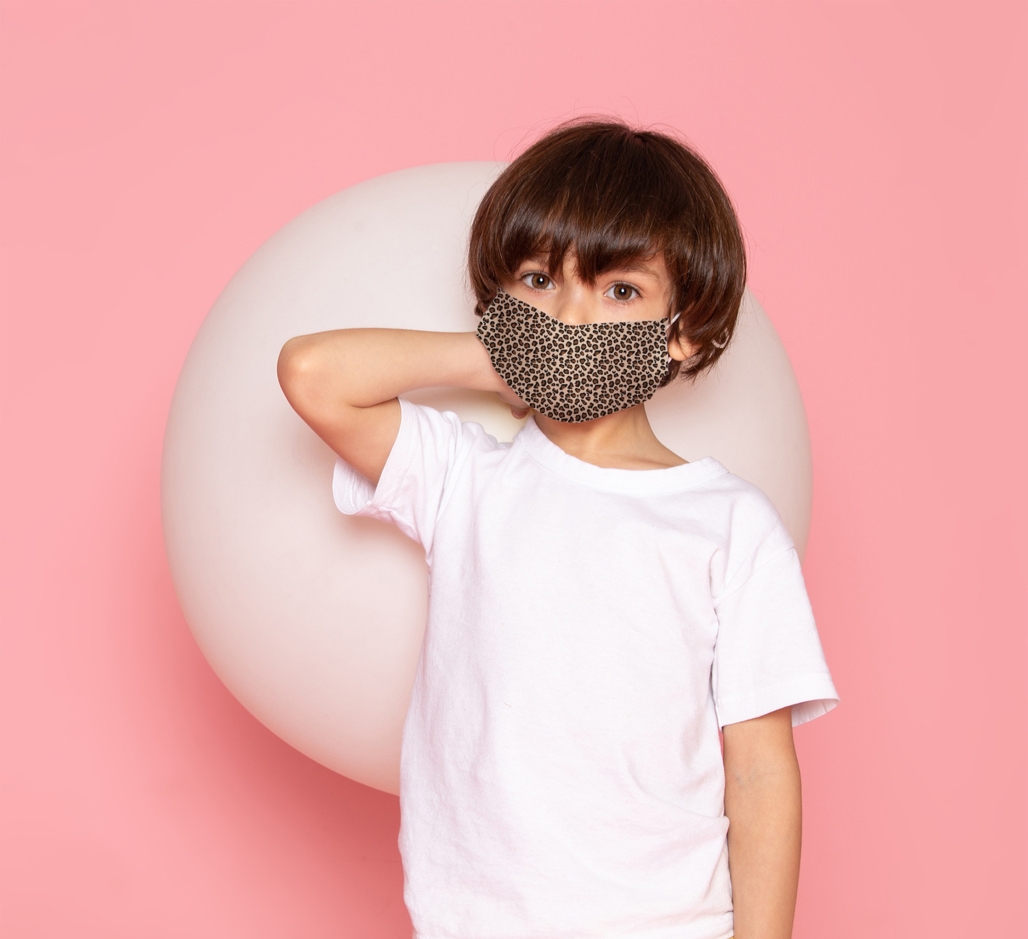 Our kids's masks are available in two sizes - Extra Small and Standard. The extra small are designed to fit 2-4 year olds, and the small to fit 4-10 year olds. The extra small face mask measures 6.25 inches wide by 3.25 inches tall, while the standard size measures 6.5 inches wide by 3.5 inches tall.