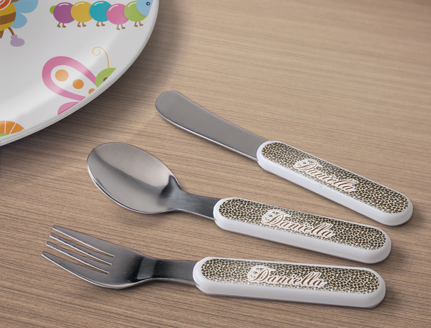 This set of kids' silverware includes a 5.5 inch spoon, fork, and knife, catered to your little one's needs. The prongs of this fork are flat and dull, while our spoon is small enough for tiny mouths, and the dullness of the knife itself resembles a butter knife, at most. These kids' utensils are made of stainless steel, while the handles are crafted from a durable plastic that will withstand the energy and use of your young one. We print your customization across the handles, making the cutlery set unique to your child only.