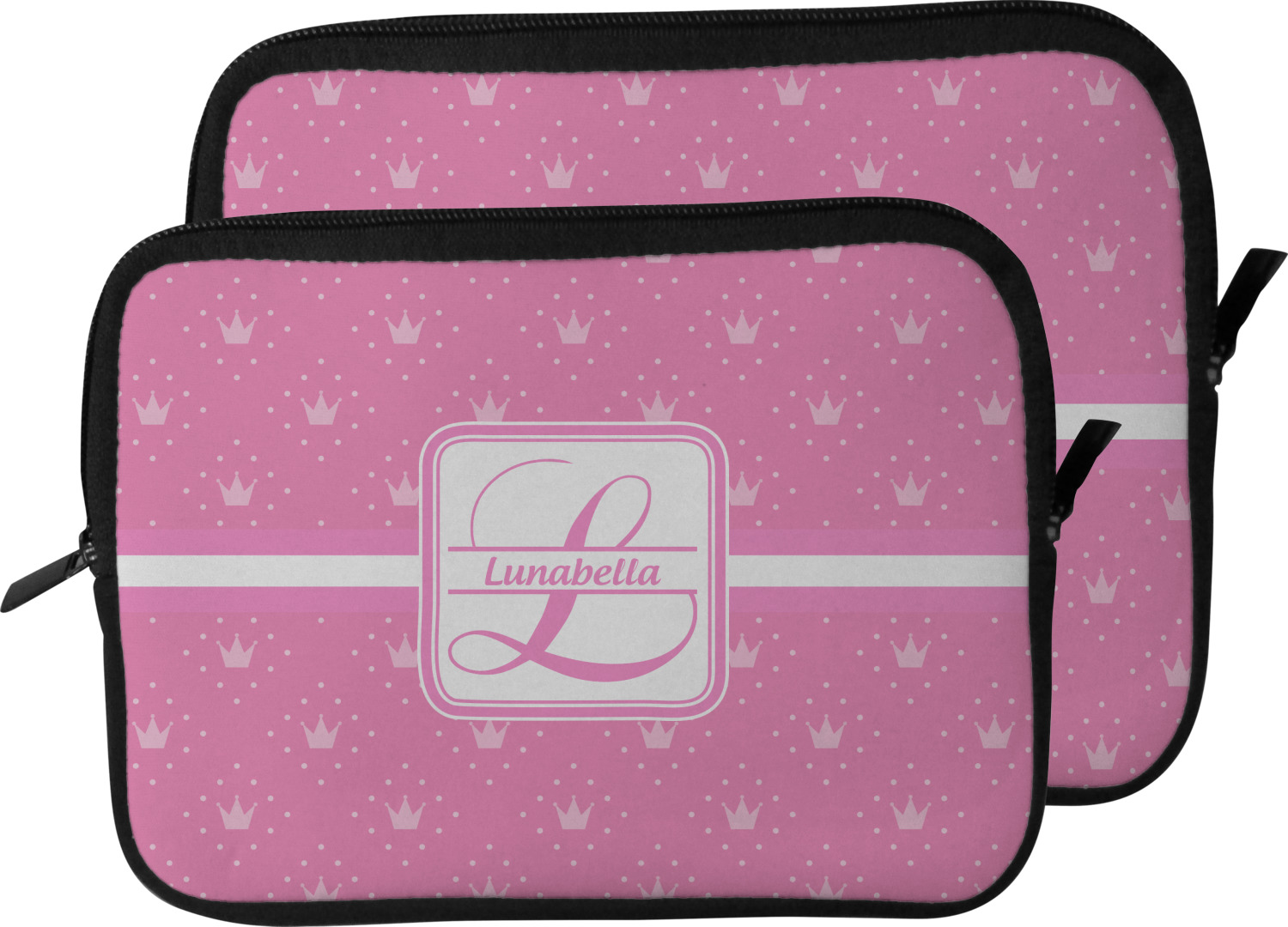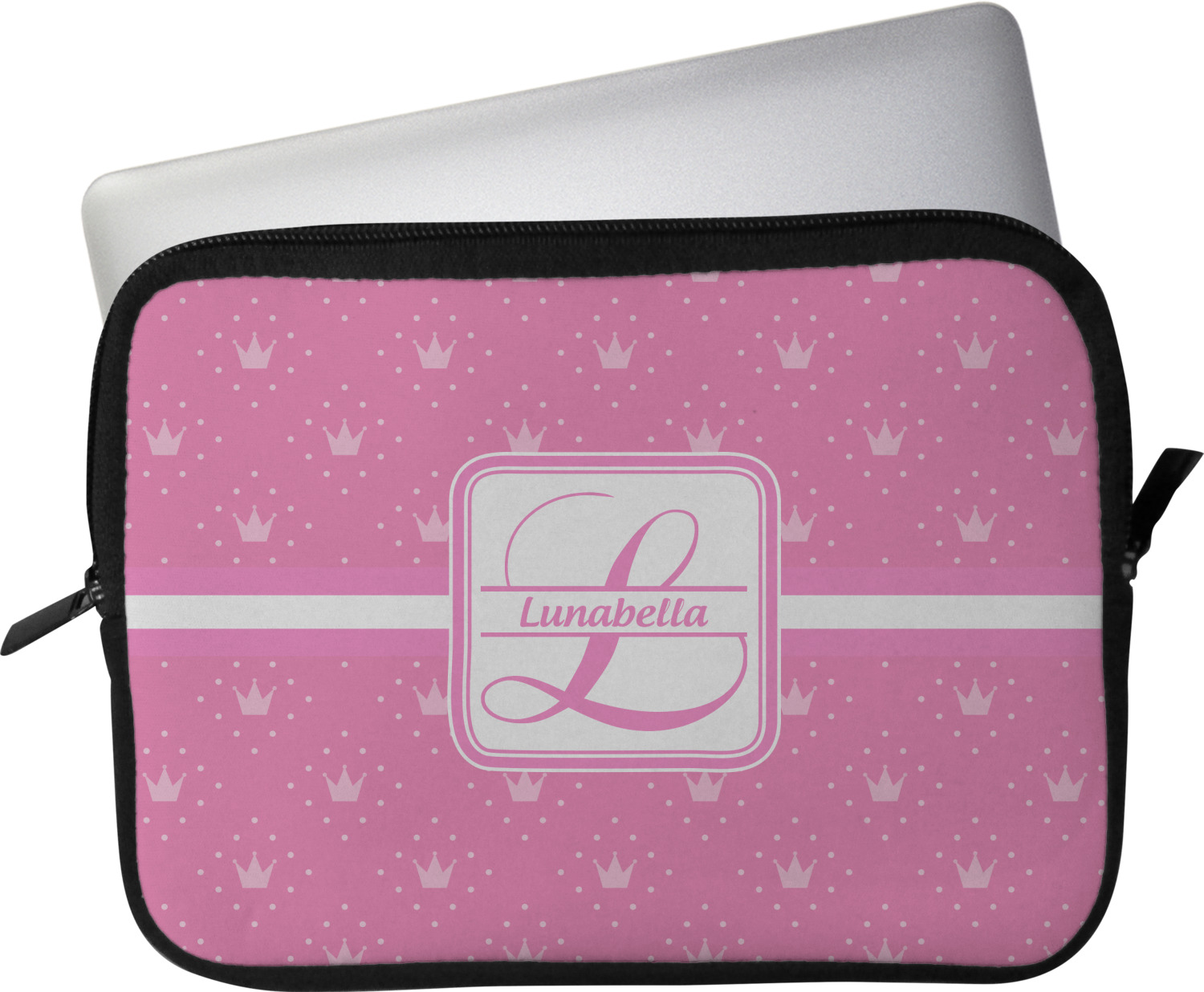 These laptop covers are built from a water-resistant, cushioned neoprene. We display your personalized design on the front of this computer sleeve, while the other sides are simply the black color of the neoprene fabric. A zipper lines the top half of this case, for direct access to your device. For added protection, the interior of this neoprene laptop sleeve is lined with a padded, minky-like material.