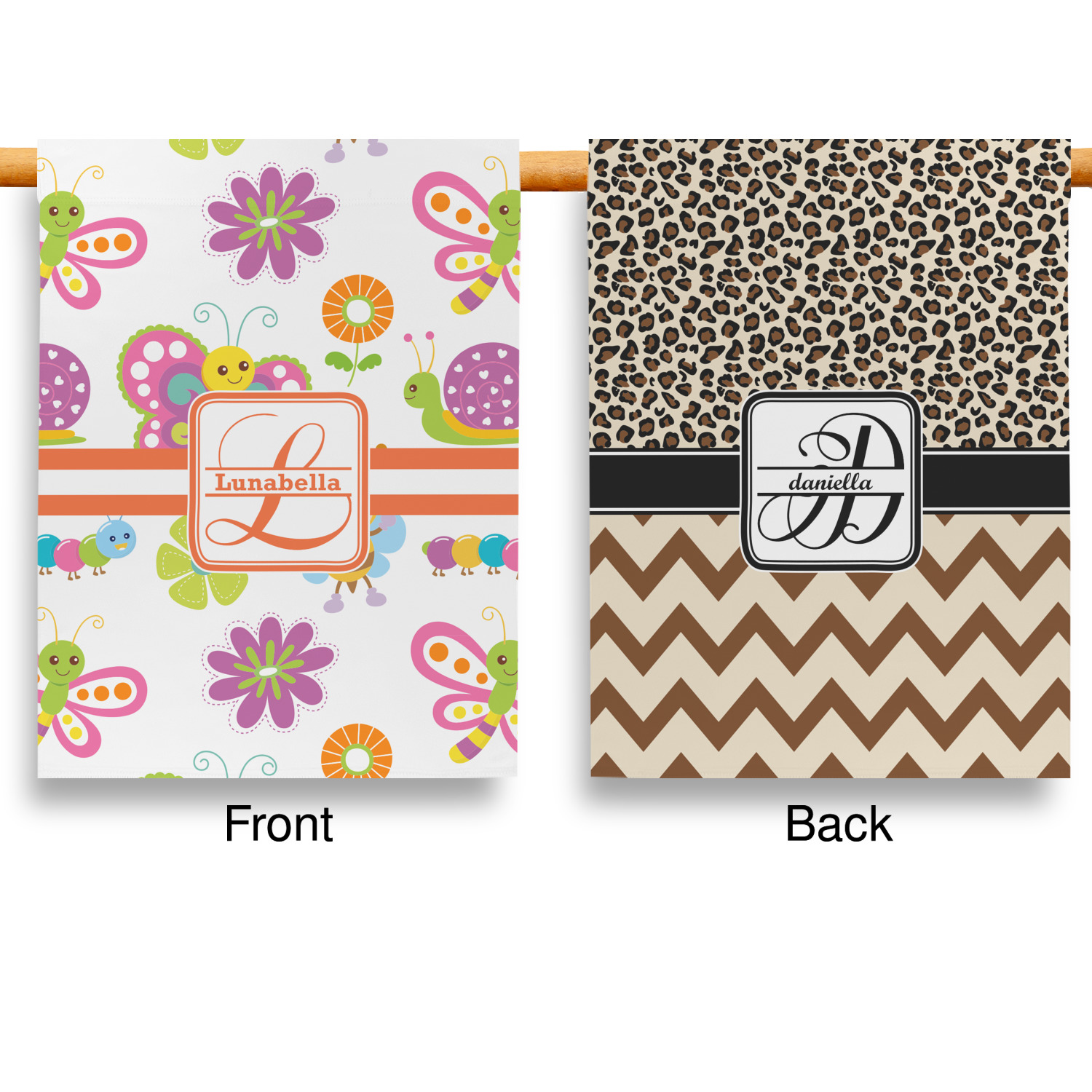 These custom garden flags are made of a durable, double-ply, polyester weave, allowing them to withstand the elements year round. The small flags measure at approximately 12 by 18 inches. The large flags measure out to 28 by 37 inches. You can order these decorative flags with your customization printed on the front only, or the front and back.