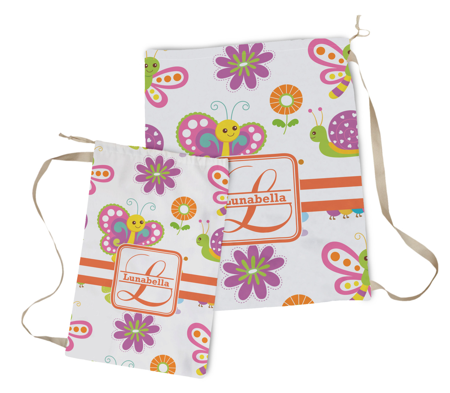 Carry your laundry in style with these customized laundry bags. Available in two sizes, featuring a natural colored woven strap and a cinch cord, these bags hold a lot of clothes or anything else you want to fit in them.