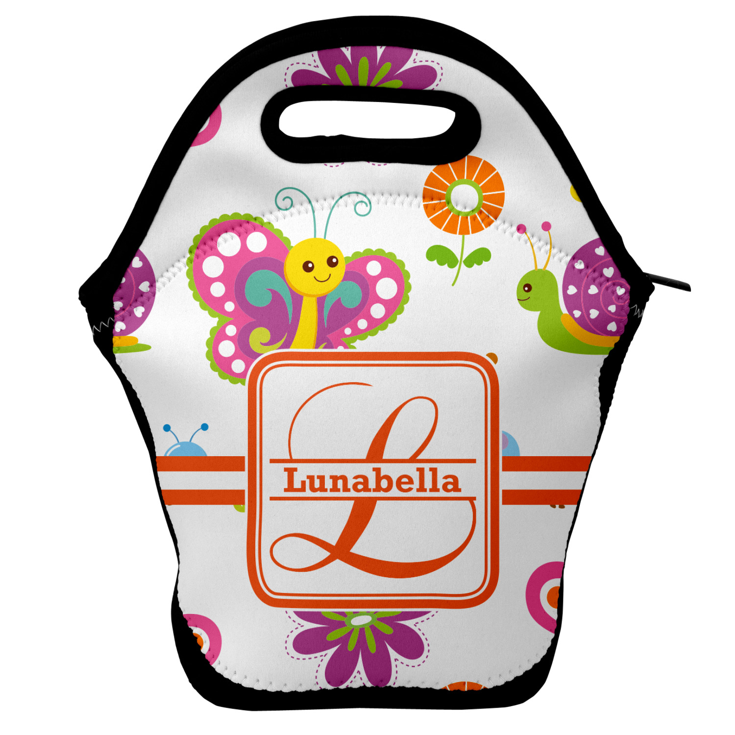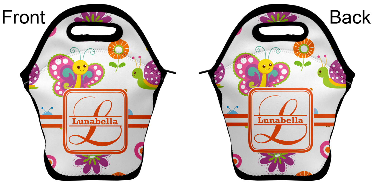 Our personalized lunch bags are made from a strong neoprene, and secure with a zipper closure that lines the top of the bag.The edges of the neoprene are sewn together with a heavy duty stitch, adding to the durability of the bag. The is accompanied by a reinforced handle at its top, for the easy transport of your lunch. We display your personalization across both the front and back of this neoprene lunch bag, while the remaining sides are a sleek black in color. Each bag measures at 13.5 inches tall, and 11.5 inches wide.