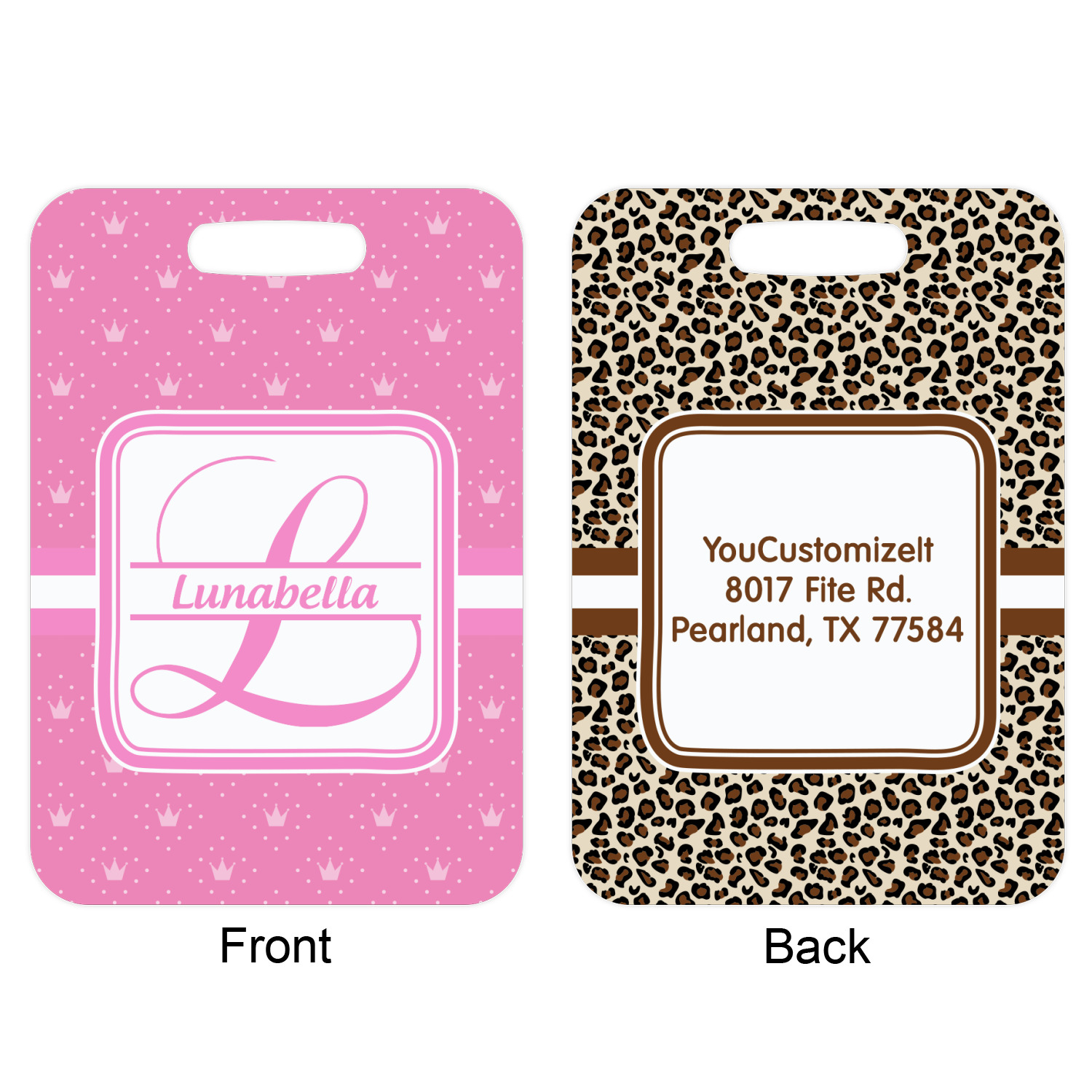 These metal luggage tags are printed on both sides; the front is printed with the design of your choice - and can be personalized with your name, name & initial or your monogram. The back can have as much or as little of your contact information as you desire - your name, your address, city, zip & state, you can also include your phone number and email address. Customize it exactly the way you want it!
