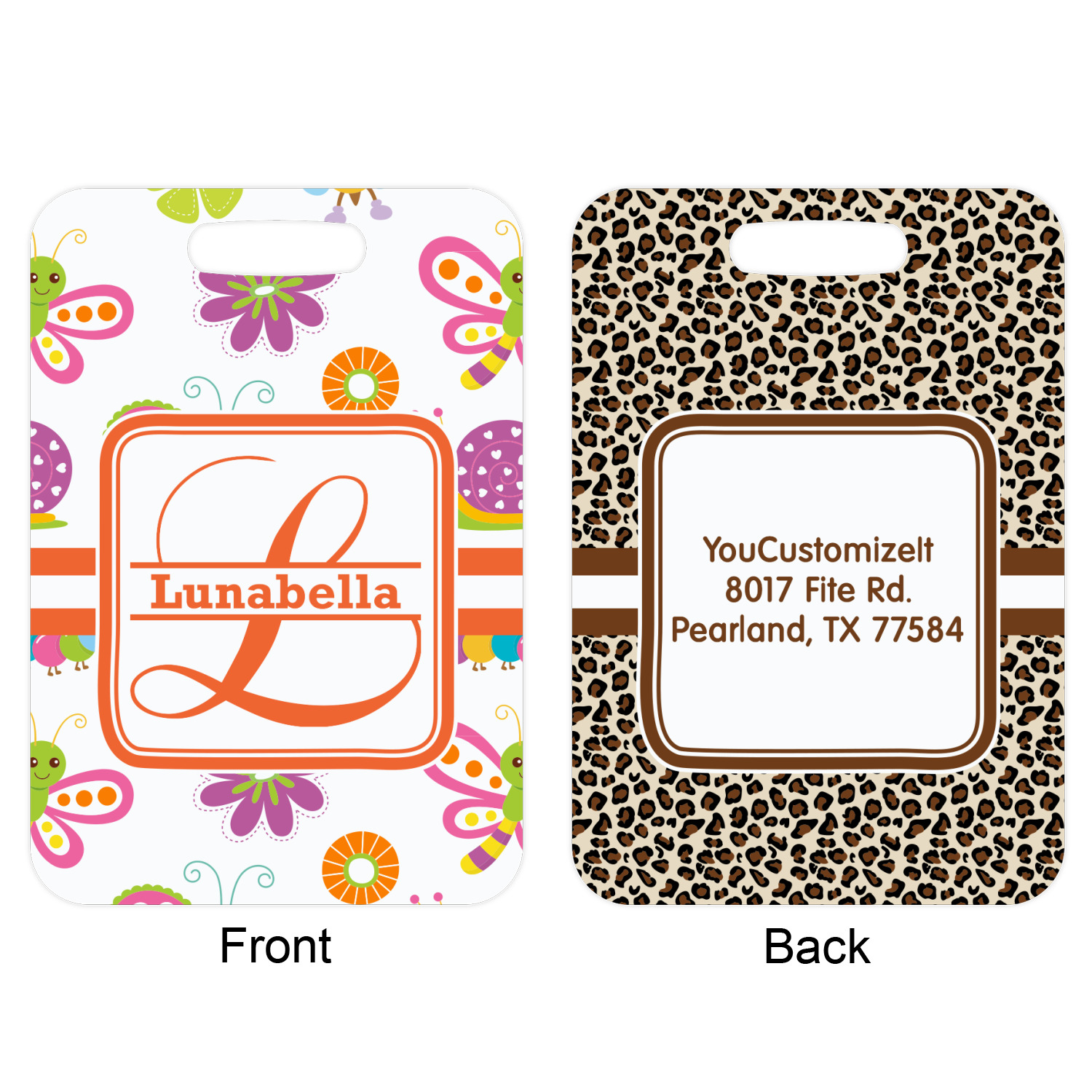 These metal luggage tags are printed on both sides; the front is printed with the design of your choice - and can be personalized with your name, name & initial or your monogram. The back can have as much or as little of your contact information as you desire - your name, your address, city, zip & state, you can also include your phone number and email address. Customize it exactly the way you want it!