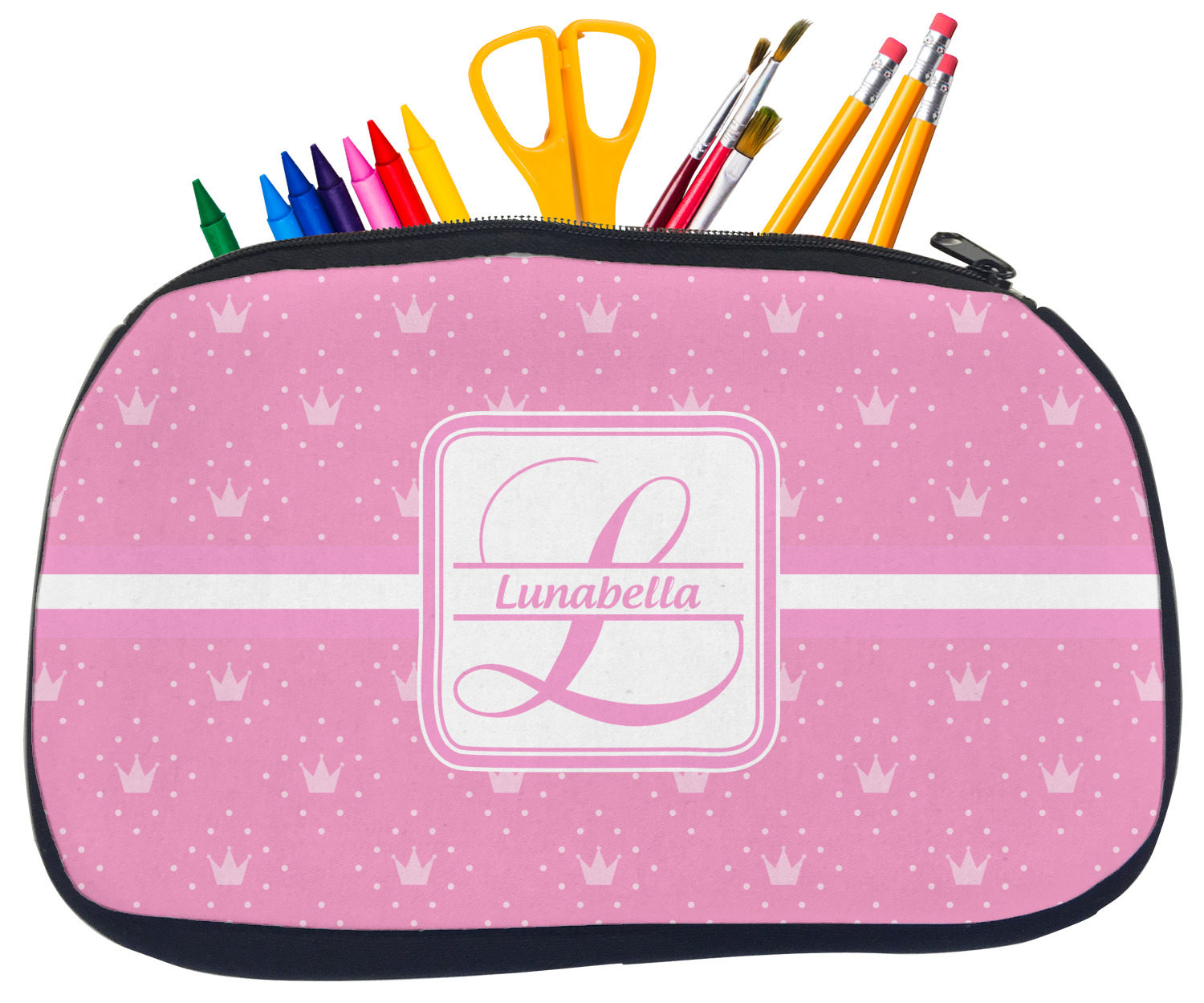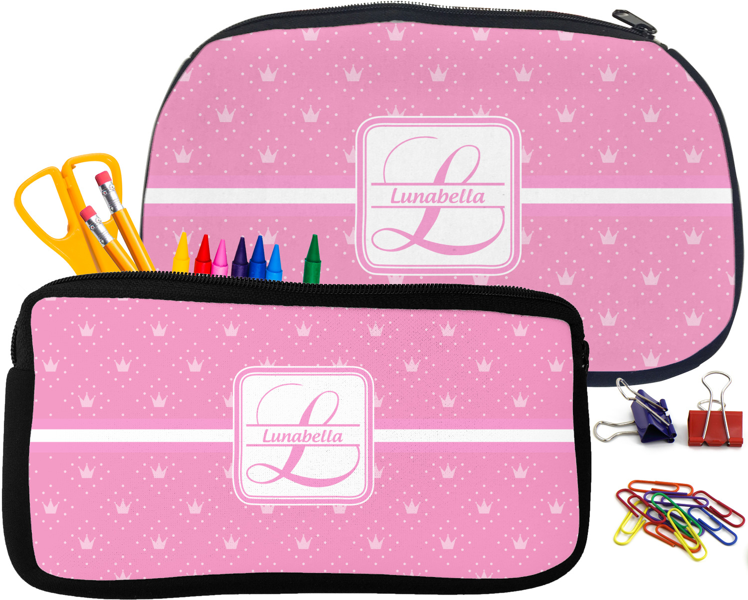 Built from durable neoprene, these pencil pouches, are water resistant, and prevent leaking ink from spilling into your backpack or purse. These custom pencil cases secure with a robust, black zipper. We print your personalized design on the front of this pouch, while the remaining sides a simple black color. These colored pencil cases [880] are sold in two sizes; our smaller version measures at 8.5 by 4.5 inches, while the medium measures at 10.5 by 6.5 inches. The smaller size is more suitable for holding pencils and pens, while our medium size can accommodate pencil sharpeners, scissors, and erasers.