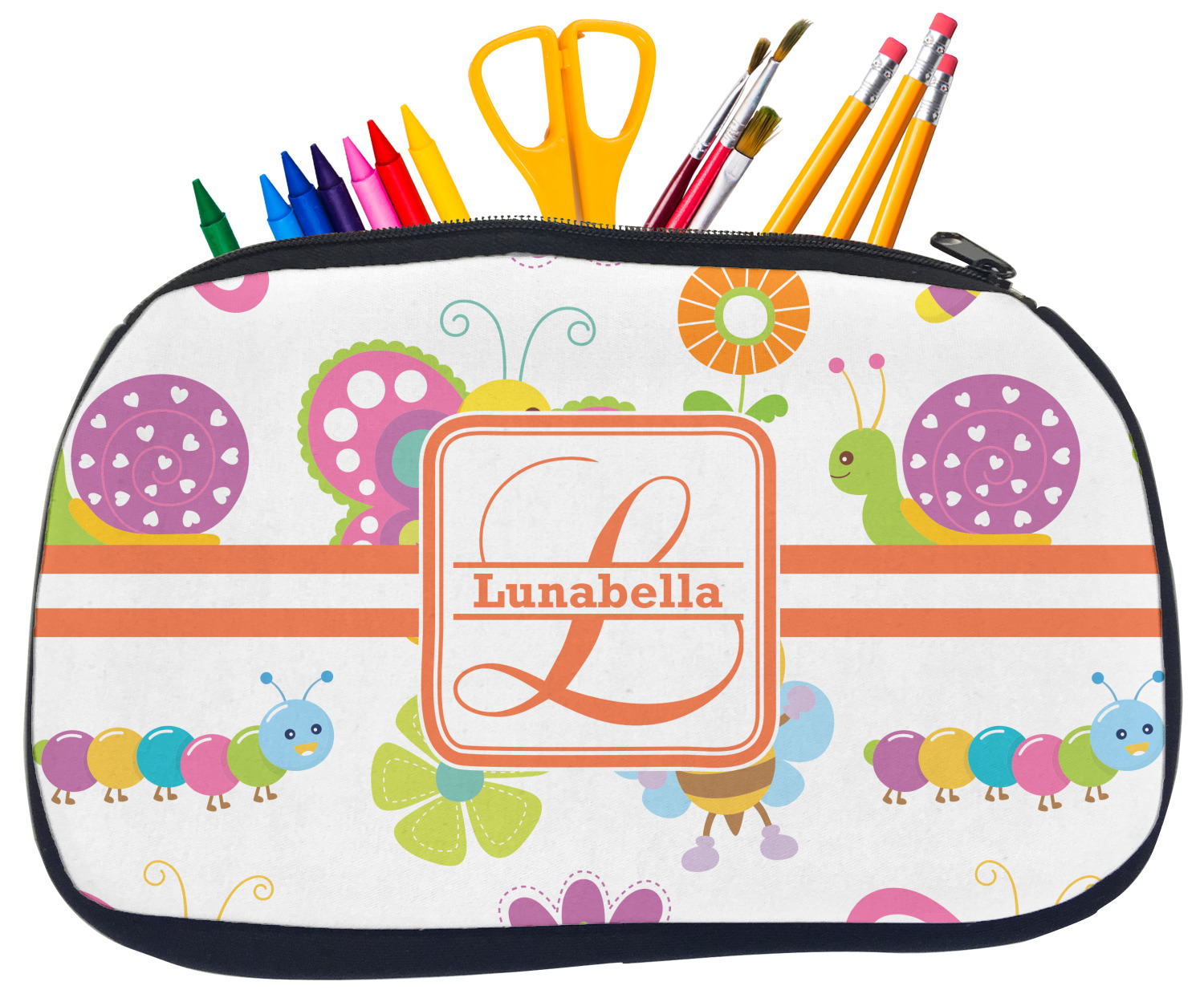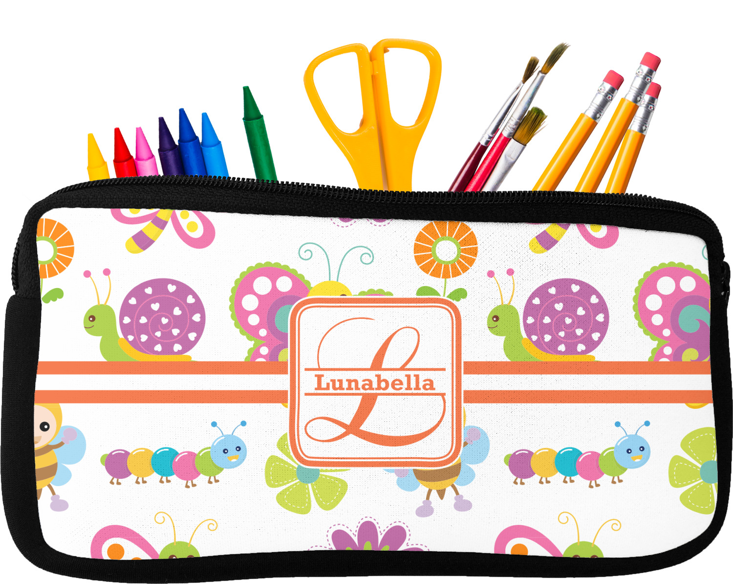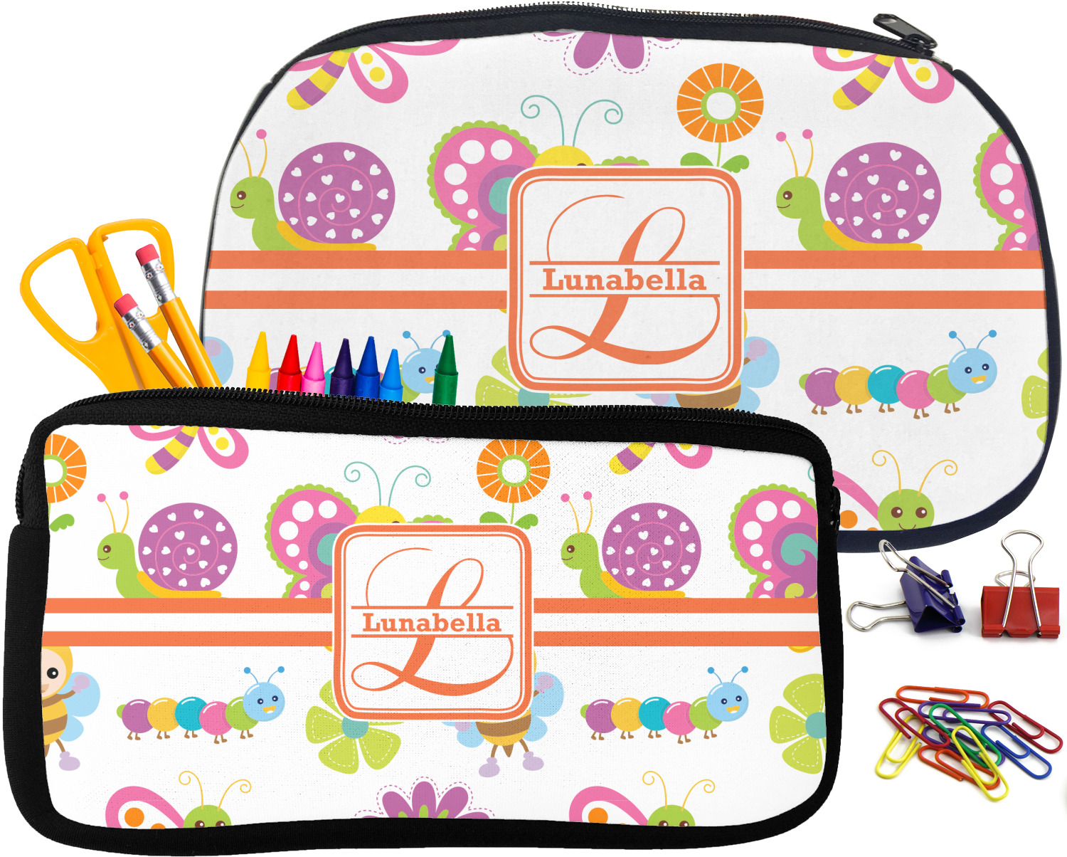 Built from durable neoprene, these pencil pouches, are water resistant, and prevent leaking ink from spilling into your backpack or purse. These custom pencil cases secure with a robust, black zipper. We print your personalized design on the front of this pouch, while the remaining sides a simple black color. These colored pencil cases [880] are sold in two sizes; our smaller version measures at 8.5 by 4.5 inches, while the medium measures at 10.5 by 6.5 inches. The smaller size is more suitable for holding pencils and pens, while our medium size can accommodate pencil sharpeners, scissors, and erasers.