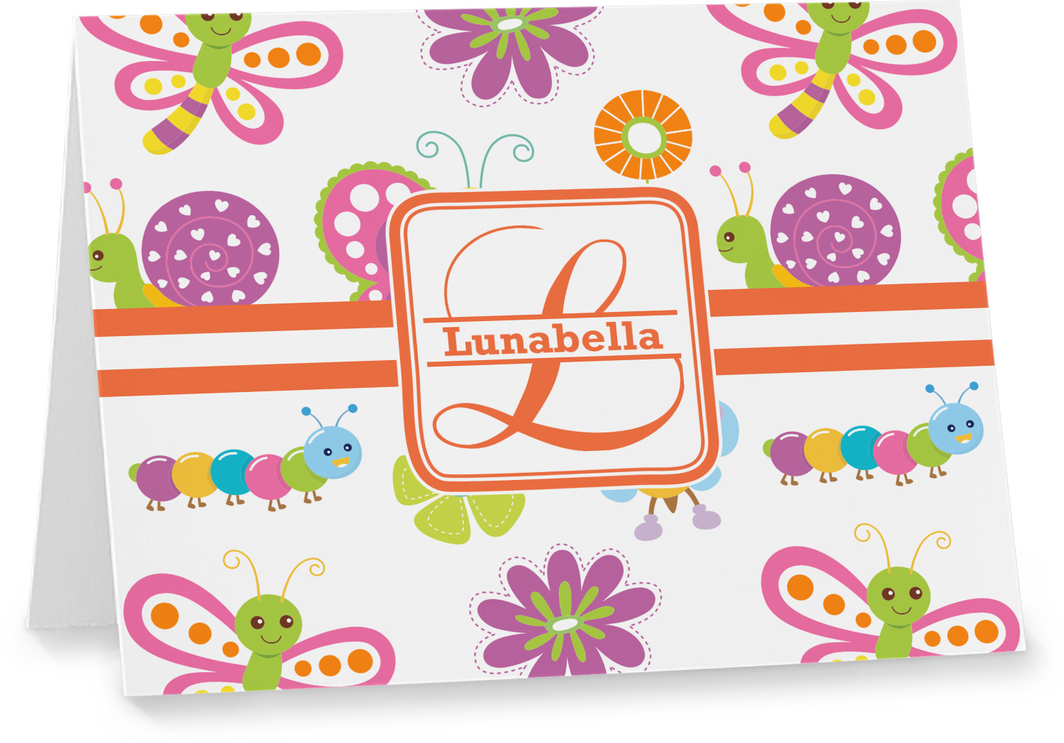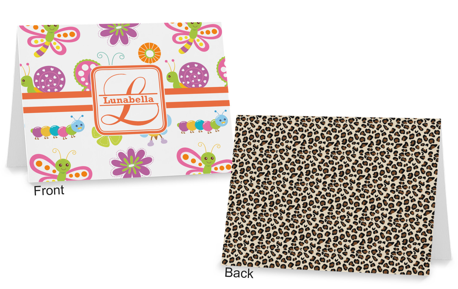 Our custom folded note cards are printed on premium 100lb. card stock and comes with white envelopes. The note card measure 5.5 by 4.25 inches and are blank on the inside for your handwritten message.