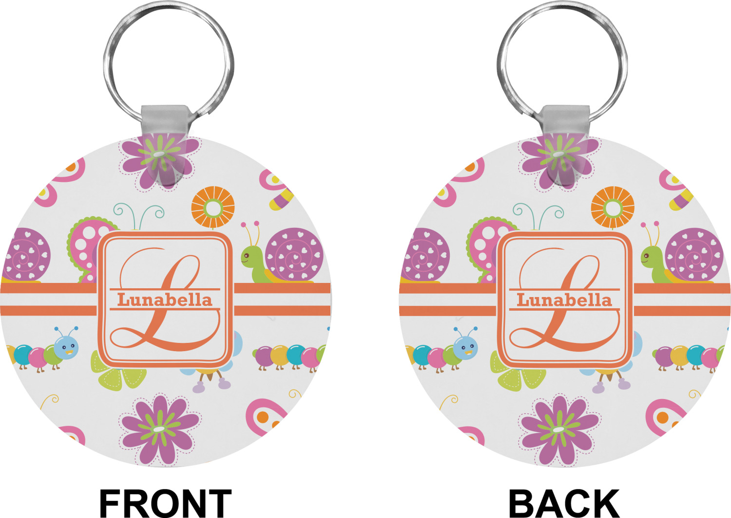 Our personalized keychains attach to the included metal, split key ring with a plastic, removable snap. Since a metal ring is included with your purchase, you have the liberty to keep your keys together on the ring, with or without your unique keychain. We offer this keychain in three different shapes: circle, heart, or diamond. We print your personalized design(s) on both sides of the key chain, and the surface has a glossy, reflective finish that only emphasizes your design. Each keychain is approximately 2.25 by 2.25 inches.