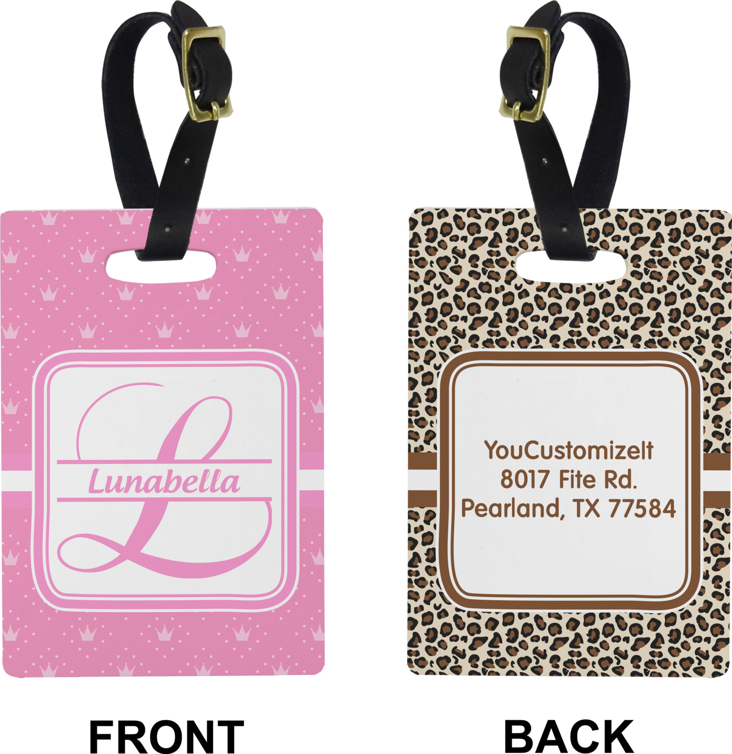 These cute luggage tags are made of a fiber-reinforced, UV-resistant plastic, making them waterproof and durable enough for both everyday use and the rugged adventures of any traveler! A leather strap with holes and a buckle is included with your purchase and can be used to attach your custom luggage tag to any suitcase, backpack, or duffel bag. You can design these travel tags as you wish; your customization will be displayed across the front, while the back will show as little or as much personal information as you want.