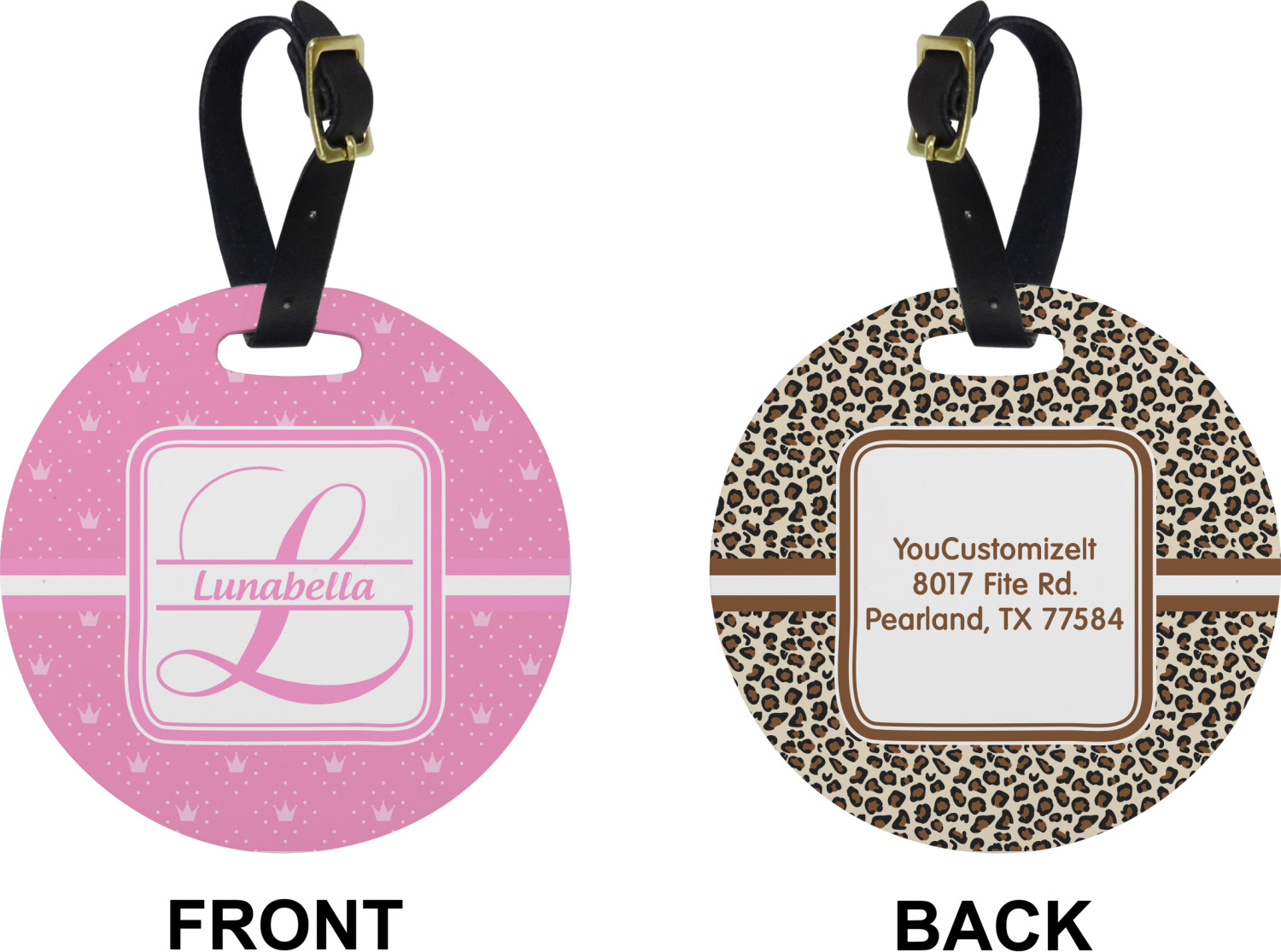 These cute luggage tags are made of a fiber-reinforced, UV-resistant plastic, making them waterproof and durable enough for both everyday use and the rugged adventures of any traveler! A leather strap with holes and a buckle is included with your purchase and can be used to attach your custom luggage tag to any suitcase, backpack, or duffel bag. You can design these travel tags as you wish; your customization will be displayed across the front, while the back will show as little or as much personal information as you want.