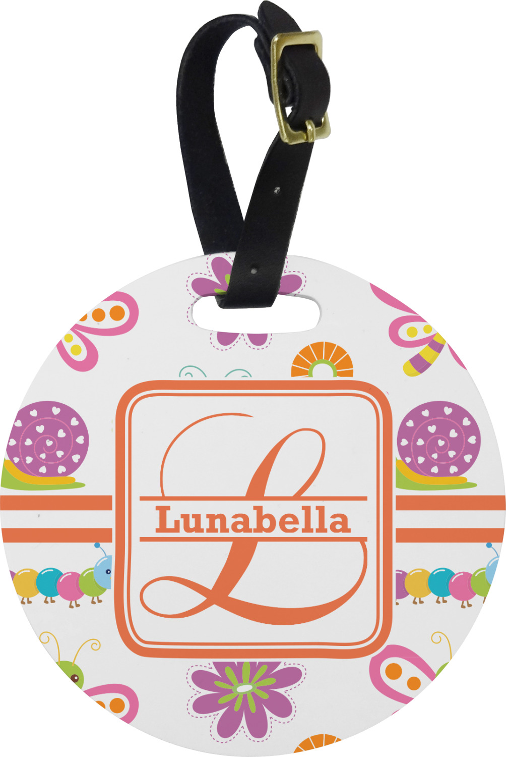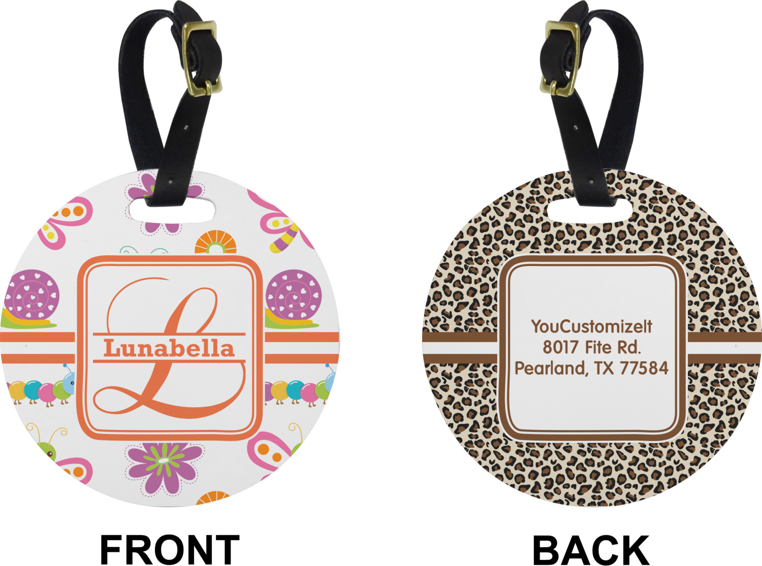 These personalized bag tags are sold in a variety of shapes, so that you may find the product that meets your vision exactly. We sell a round luggage tag, which measures at approximately 4" x 4". Our square luggage tag is about 3.5" x 3.5", while our rectangular version is 2.75" x 4 ".