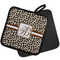 Our personalized pot holders feature a neoprene front that displays your personalization in vibrant colors. The backing of the hot pot holder is rubberized; the textured backing allows you to have a great grip when using this custom pot holder. The two materials are joined with a sleek, black trim, and the holder also includes an attached loop for hanging and storage. The pot holder is approximately 8.75 inches by 8.75 inches and 0.25 inches tall, while the fabric loop is 2.5 inches long. You can purchase a kitchen pot holder by itself or as a set of 2. We also offer a set including one pot holder and one oven mitt.