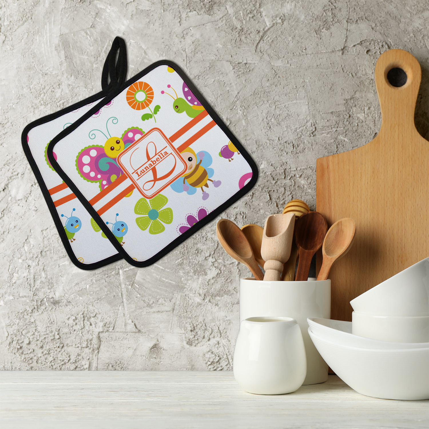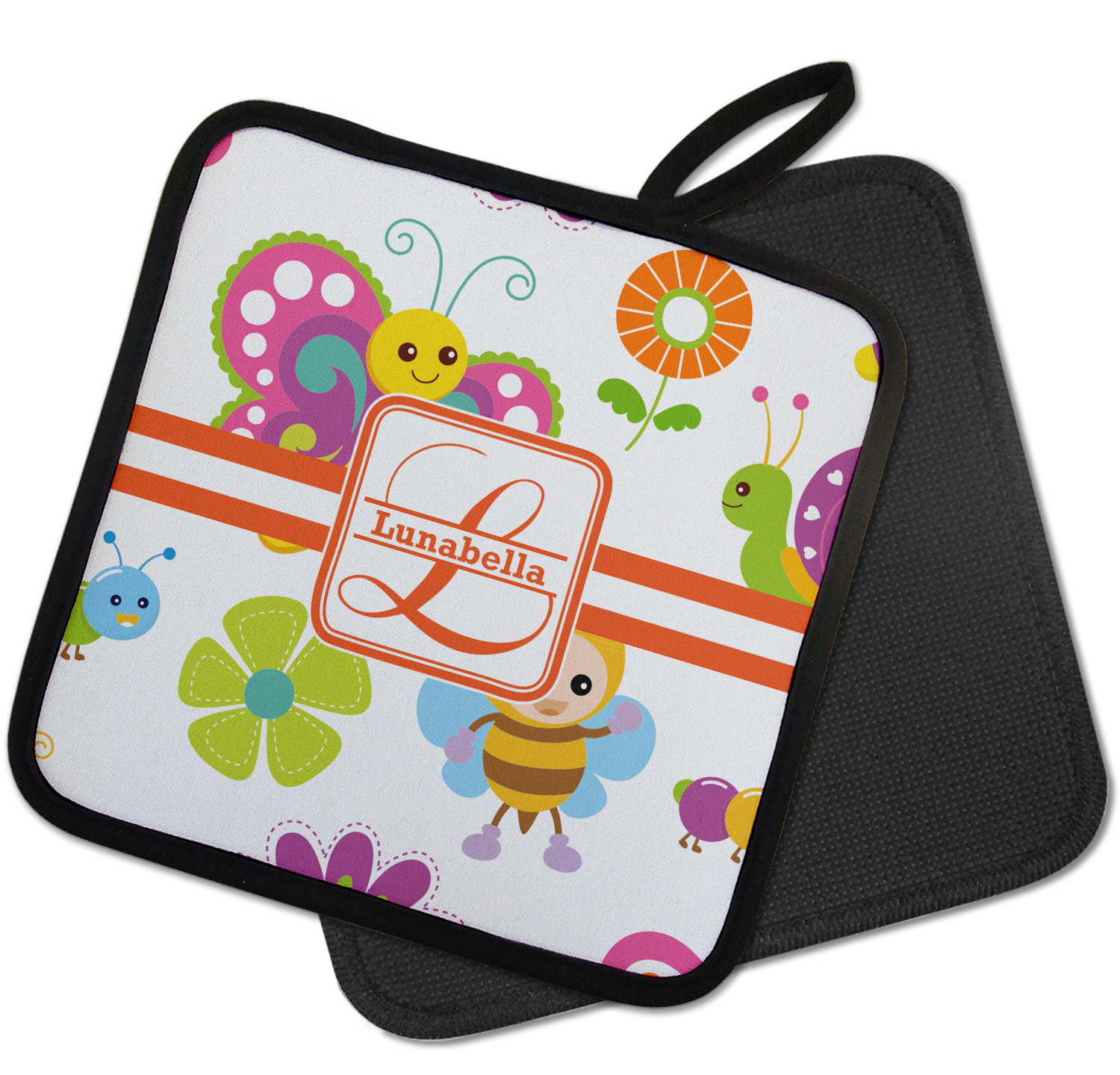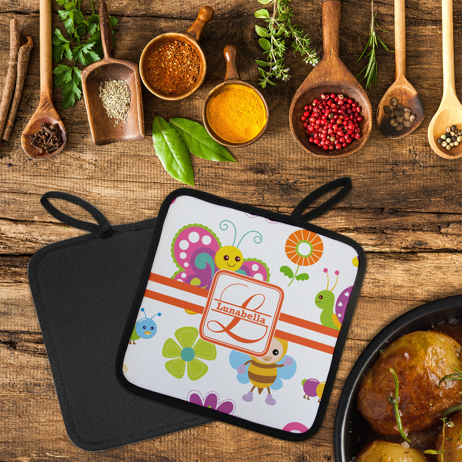 Our personalized pot holders feature a neoprene front that displays your personalization in vibrant colors. The backing of the hot pot holder is rubberized; the textured backing allows you to have a great grip when using this custom pot holder. The two materials are joined with a sleek, black trim, and the holder also includes an attached loop for hanging and storage. The pot holder is approximately 8.75 inches by 8.75 inches and 0.25 inches tall, while the fabric loop is 2.5 inches long. You can purchase a kitchen pot holder by itself or as a set of 2. We also offer a set including one pot holder and one oven mitt.