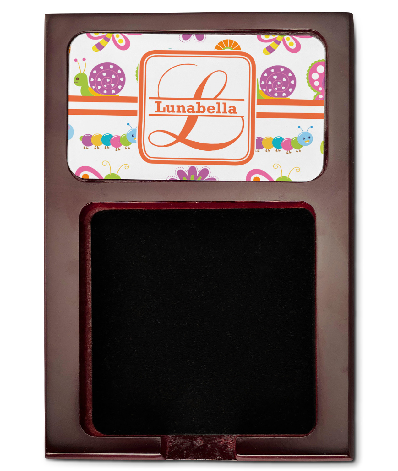 Crafted from a fine mahogany, this post it note holder is in the shade of a dark, cherry color. The dispenser itself is about 4.25 by 6.25 by 0.75 inches. You can place your 3 by 3 inch sticky notes in the indentation below the nameplate. We print your customization onto the nameplate that rests above the velvety indentation.