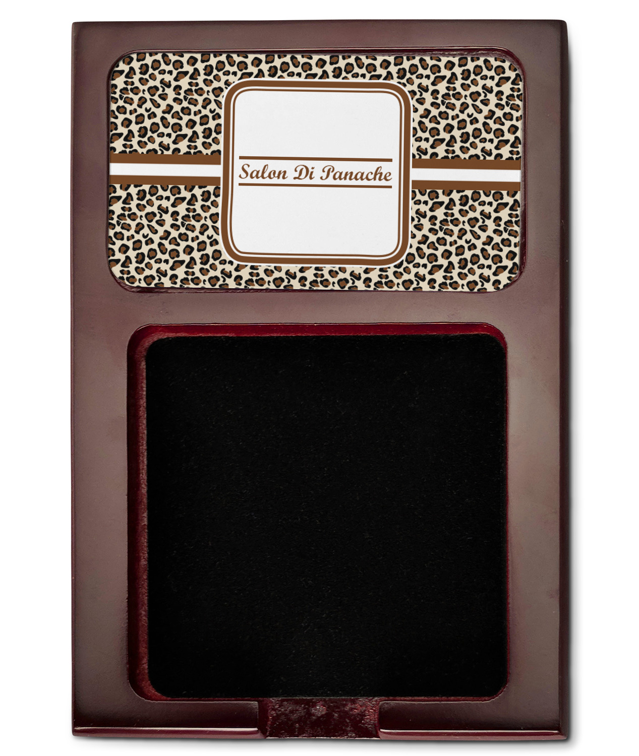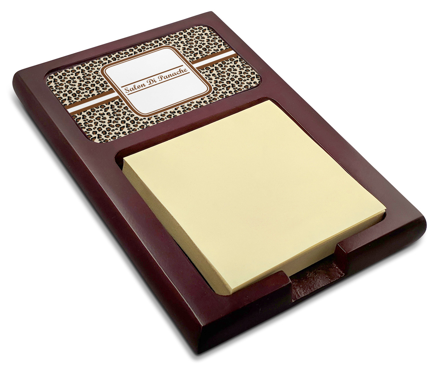 Crafted from a fine mahogany, this post it note holder is in the shade of a dark, cherry color. The dispenser itself is about 4.25 by 6.25 by 0.75 inches. You can place your 3 by 3 inch sticky notes in the indentation below the nameplate. We print your customization onto the nameplate that rests above the velvety indentation.