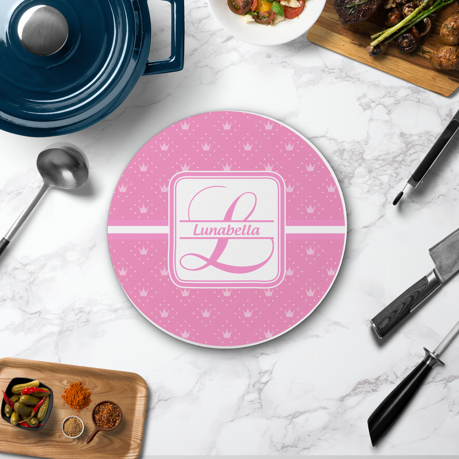 The round trivets can be customized with your own design, your own photo, or your own logo. You can add personalization, like a monogram, family name or initial to your uploaded design / art. You can also customize one of our designs and change the patterns, colors, personalization, fonts etc.