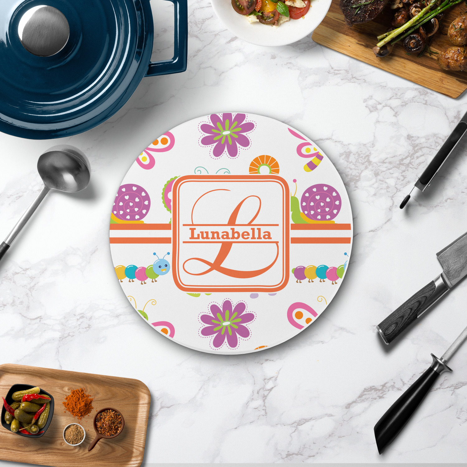 The round trivets can be customized with your own design, your own photo, or your own logo. You can add personalization, like a monogram, family name or initial to your uploaded design / art. You can also customize one of our designs and change the patterns, colors, personalization, fonts etc.