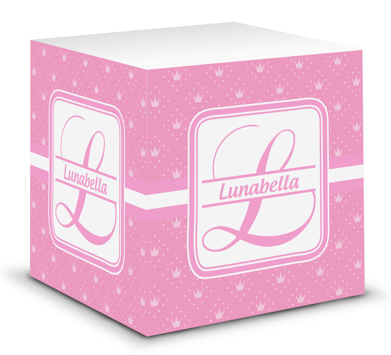 This note cube features 700 sheets of matte, white paper. Each sheet measures at 3.5 by 3.5 inches and has an adhesive strip at its top. Your personalized design is displayed on all four edges of the sticky pad.