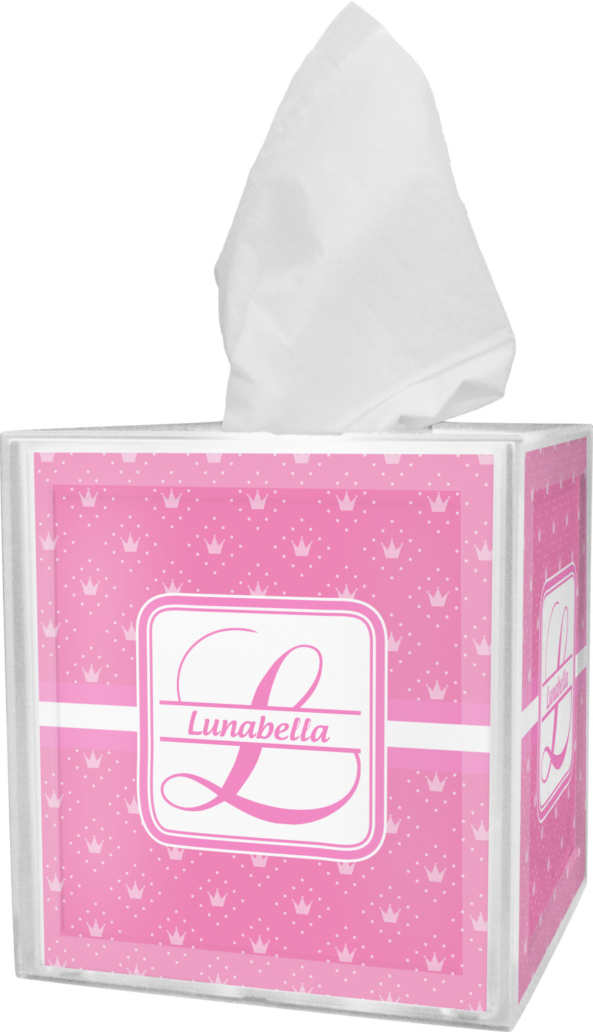 These tissue holders are built from durable acrylic and display your unique personalization on fine-quality vinyl inserts placed within the four sides and top. The box features two pieces, allowing you to easily switch out tissue boxes. On the sides, youll find ridges that ensure the top and base fit securely in place. The bottom of these tissue box holders has four, rubber, non-slip pads to prevent the box from scuffing any surface you decide to display it on. Each box can fit a standard 5 by 5-inch box of tissues.