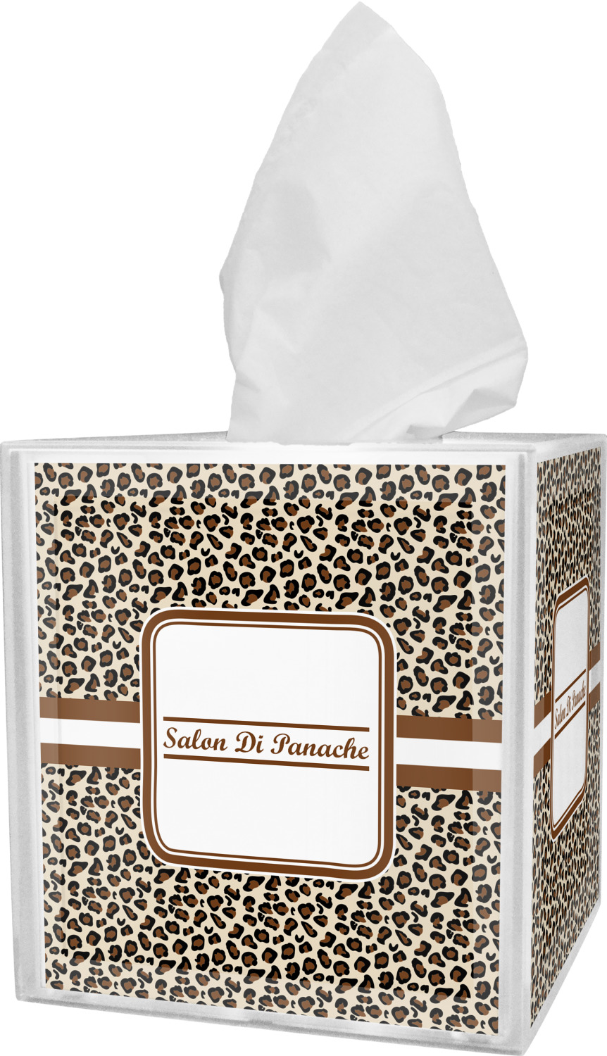 These tissue holders are built from durable acrylic and display your unique personalization on fine-quality vinyl inserts placed within the four sides and top. The box features two pieces, allowing you to easily switch out tissue boxes. On the sides, youll find ridges that ensure the top and base fit securely in place. The bottom of these tissue box holders has four, rubber, non-slip pads to prevent the box from scuffing any surface you decide to display it on. Each box can fit a standard 5 by 5-inch box of tissues.