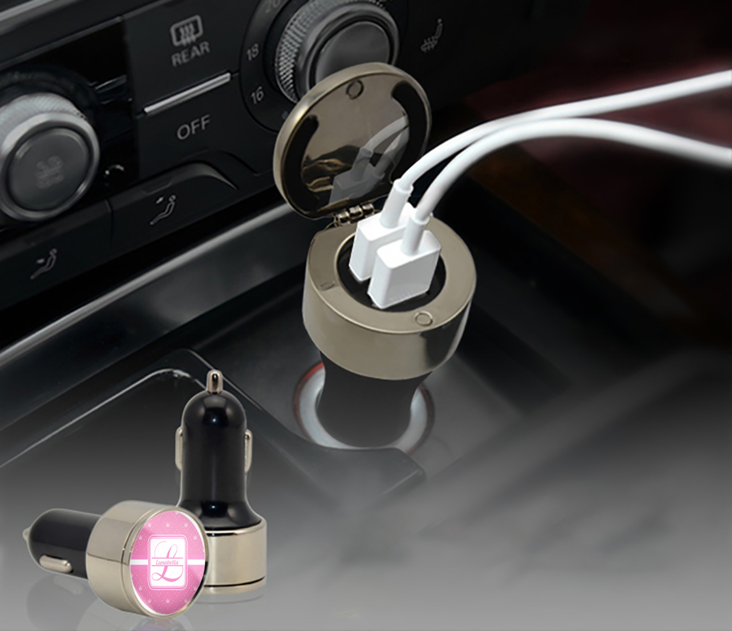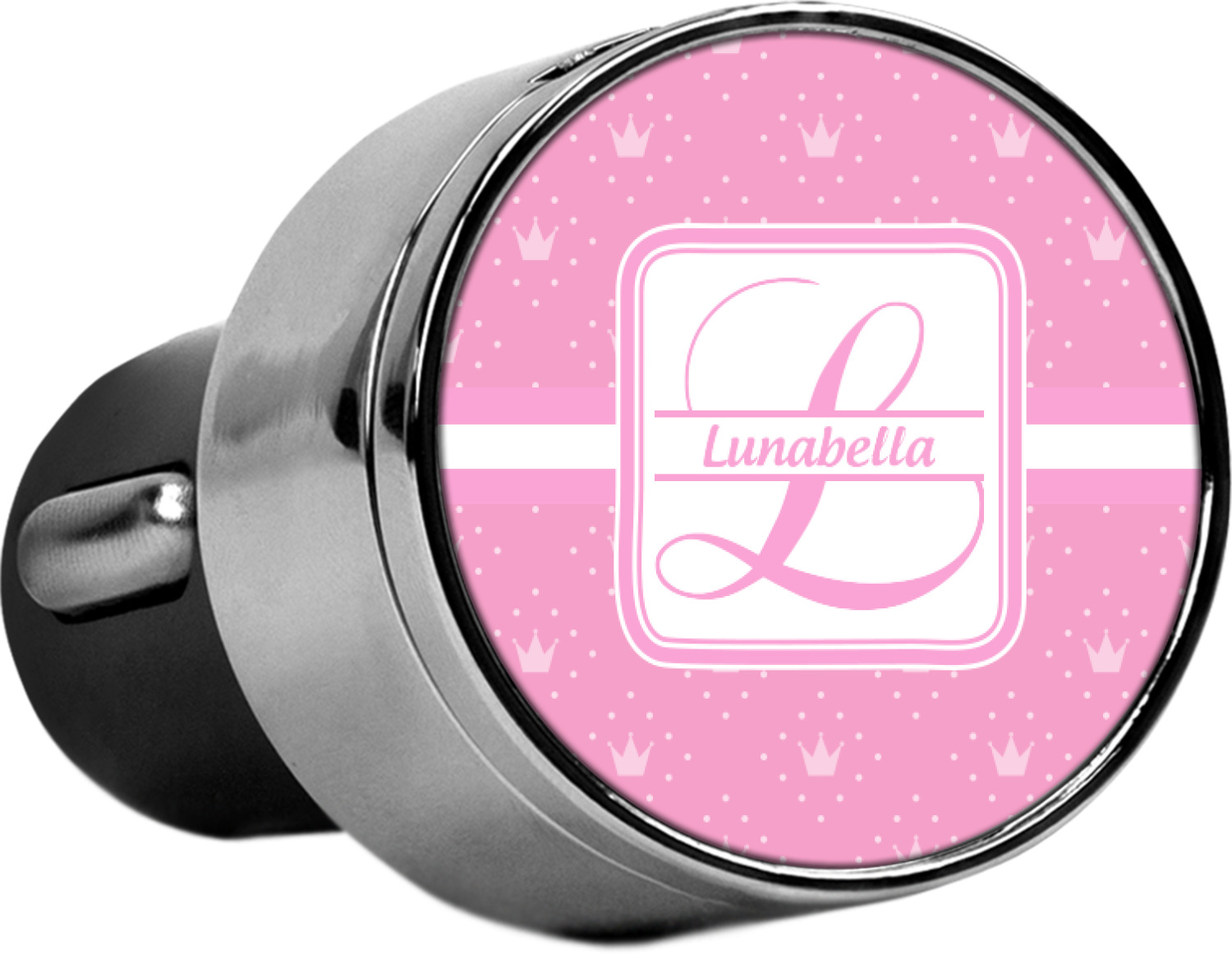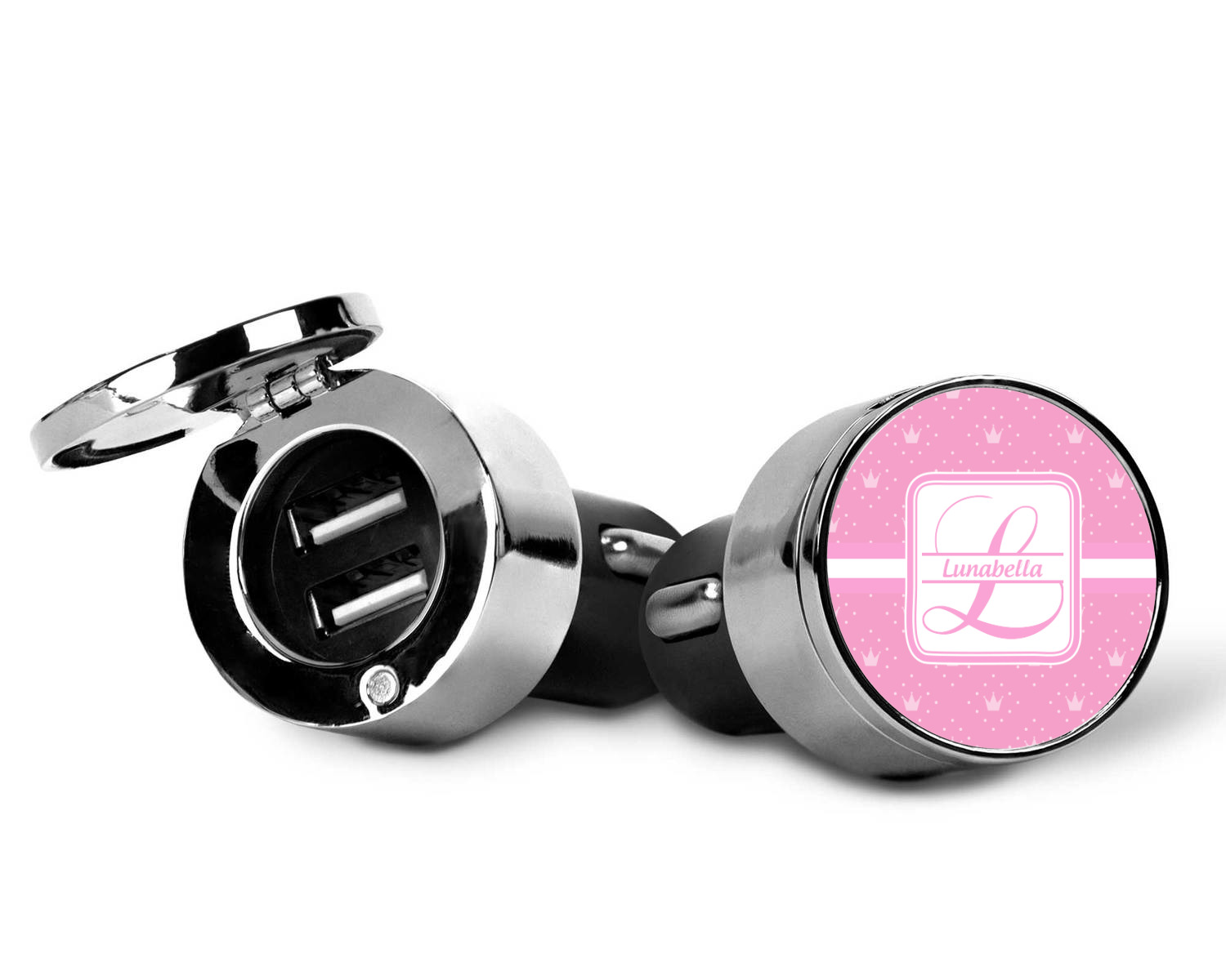 This car charger adapter converts your cars bland cigarette lighter into a decorative, personalized, and operational USB charging port. Made of solid, silver-plated metal, these chargers feature a flip-open lid that both displays your customized design and conceals two USB ports. The metal lid of the USB car charger adapter is 1.5" in diameter and seals due to a small, ingrained magnet on both the charger and its lid. The cigarette lighter insert, itself, is colored black.