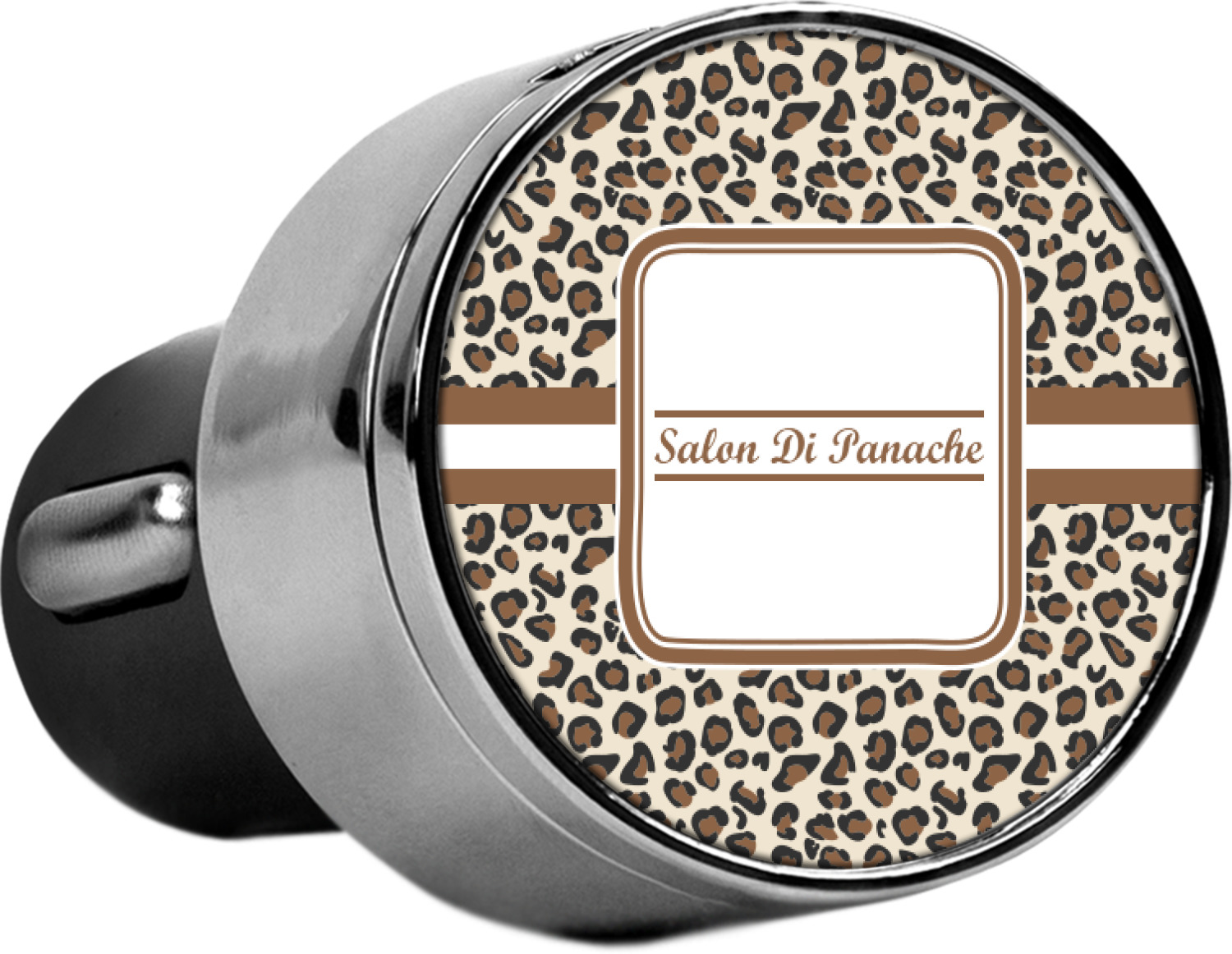This car charger adapter converts your cars bland cigarette lighter into a decorative, personalized, and operational USB charging port. Made of solid, silver-plated metal, these chargers feature a flip-open lid that both displays your customized design and conceals two USB ports. The metal lid of the USB car charger adapter is 1.5" in diameter and seals due to a small, ingrained magnet on both the charger and its lid. The cigarette lighter insert, itself, is colored black.