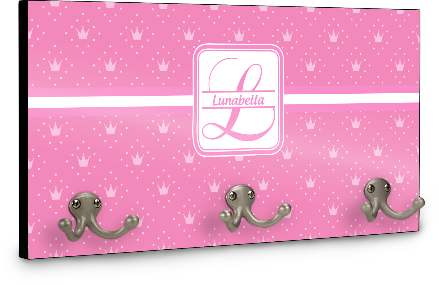 This coat rack is the perfect way to add some personality to your wall or entryway. The board is made of a strong maple that is approximately 16" x 8". The three 2-prong hooks are a sturdy metal that have two screws attaching them to the board. Your design is printed right onto the front of the board while the back and sides are a simple black.