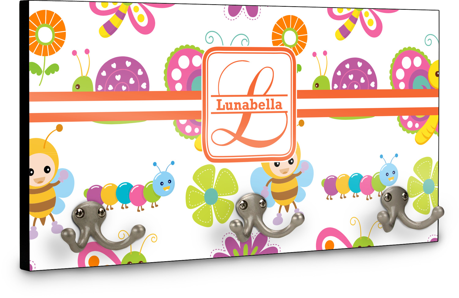 This coat rack is the perfect way to add some personality to your wall or entryway. The board is made of a strong maple that is approximately 16" x 8". The three 2-prong hooks are a sturdy metal that have three screws attaching them to the board. Your design is printed right onto the front of the board while the back and sides are a simple black.