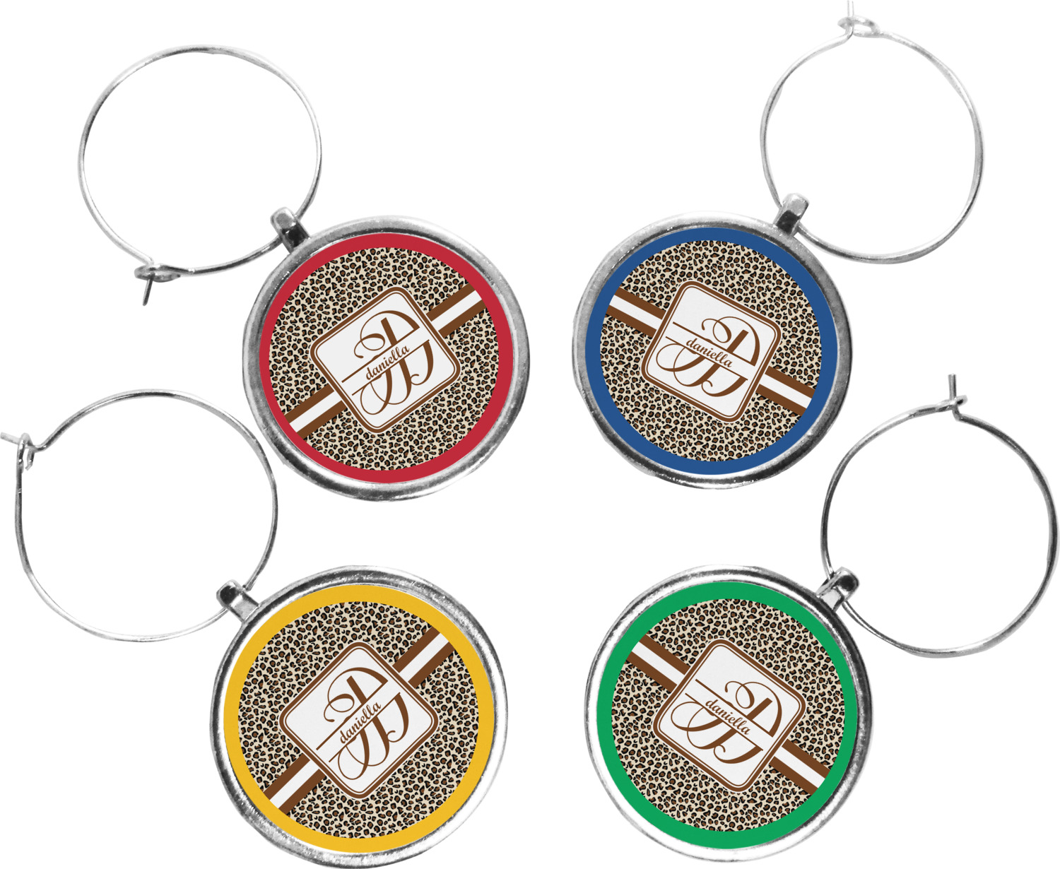 Your wine glass markers are comprised of a circular zinc plate with a 1.25 inch diameter. The zinc plate hangs from a zinc loop, which can be easily secured and removed from the stem of a wine glass. Your customized design is printed onto a 1 inch diameter insert, and then placed into the wine glass charm itself. Though sold in a set of four, you can personalize each charm individually and change the colors of the ring around your design, depending on your needs.