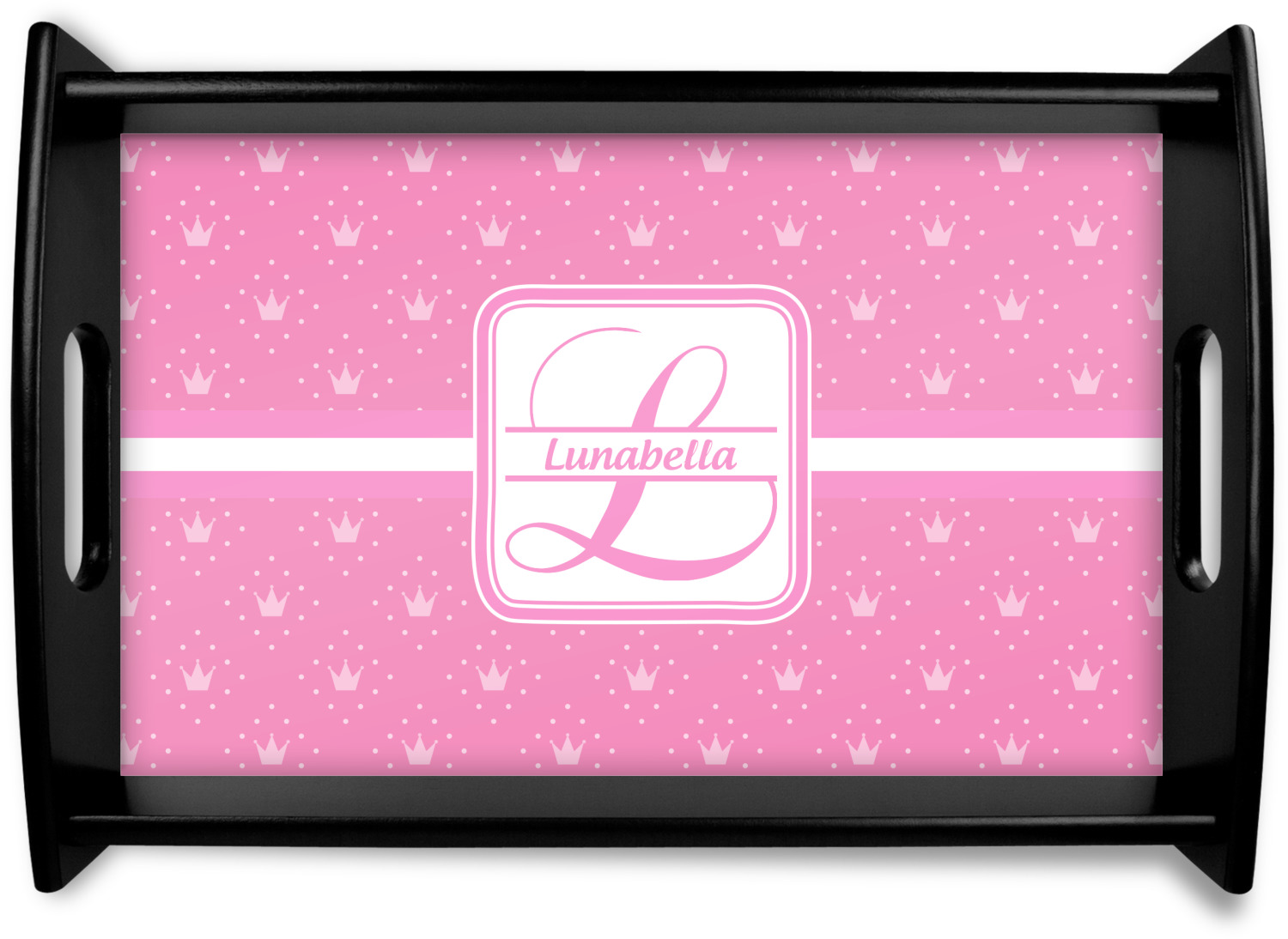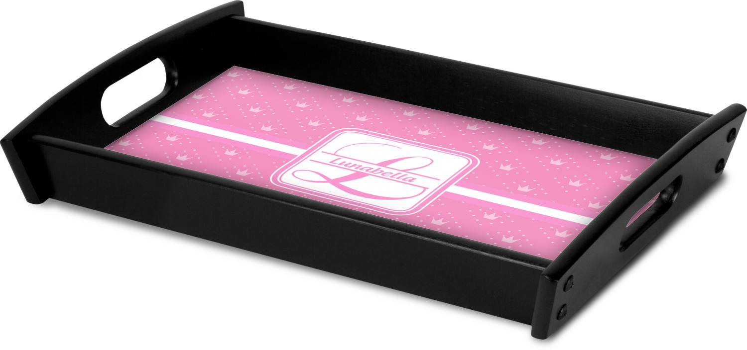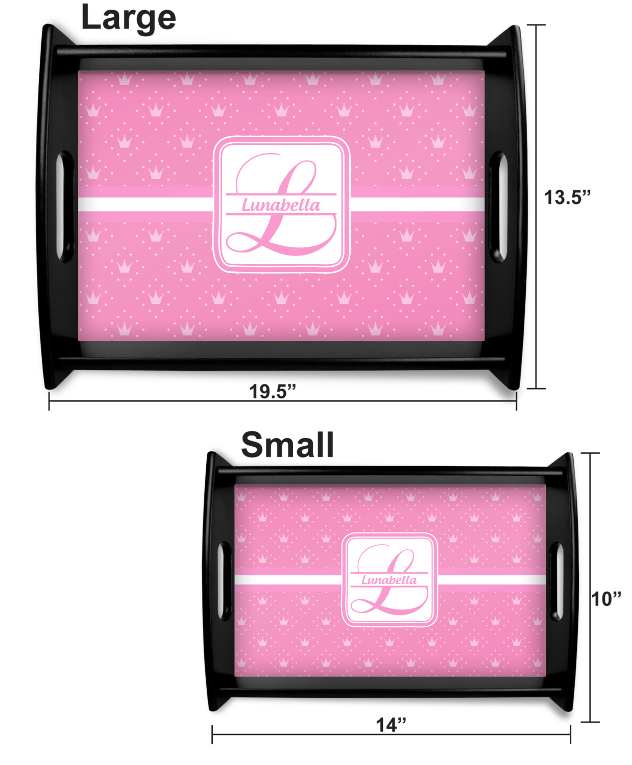 This serving tray with handles features square edges and two rounded sides, creating a very modern look. Each side is fabricated from a beautifully cut, natural wood. The bottom of the interior of the tray displays your customized design in bright, vibrant color. The tray is sold in both a black color and a natural wood look. Each variation of the wood serving tray has two sizes: Small, which is 14" x 10" x 2.25", and Large, which is 19.5" x 13.5" x 2.75".