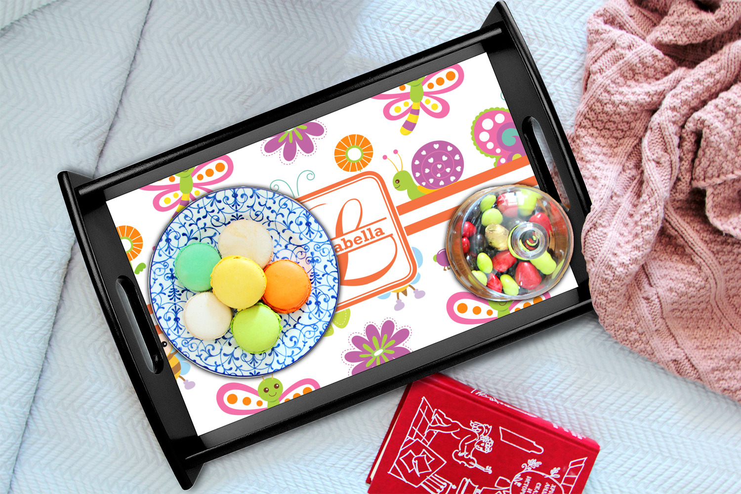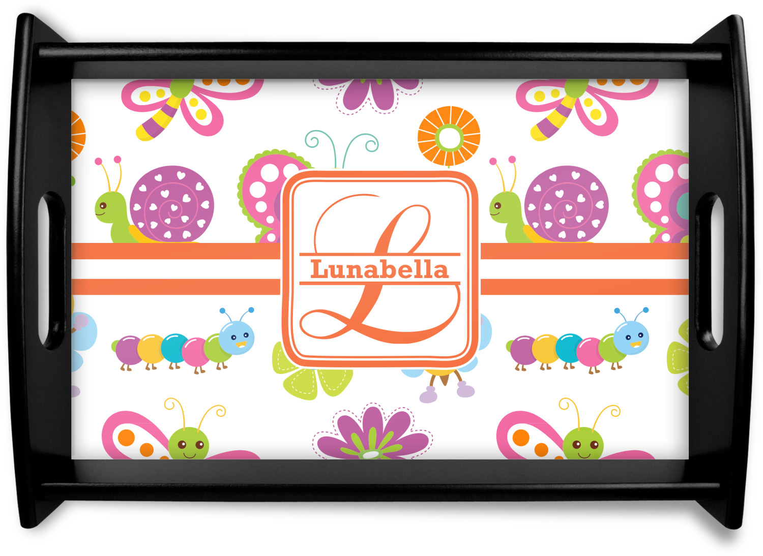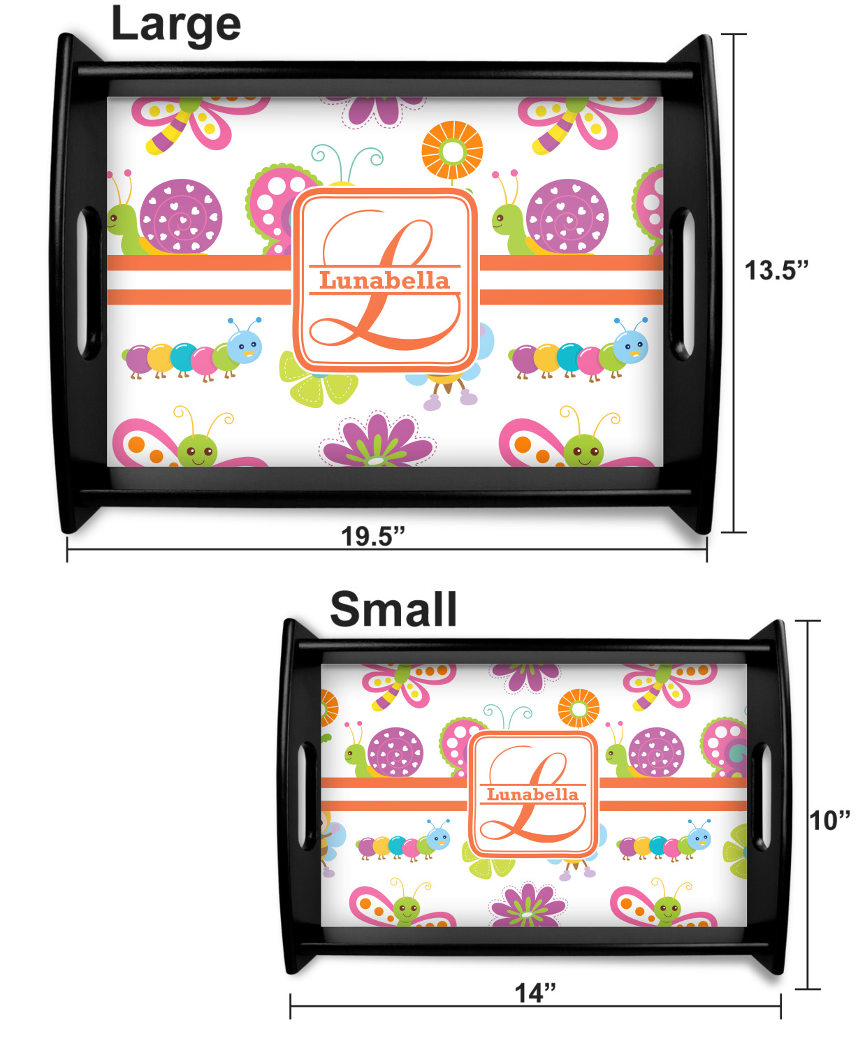 This serving tray with handles features square edges and two rounded sides, creating a very modern look. Each side is fabricated from a beautifully cut, natural wood. The bottom of the interior of the tray displays your customized design in bright, vibrant color. The tray is sold in both a black color and a natural wood look. Each variation of the wood serving tray has two sizes: Small, which is 14" x 10" x 2.25", and Large, which is 19.5" x 13.5" x 2.75".