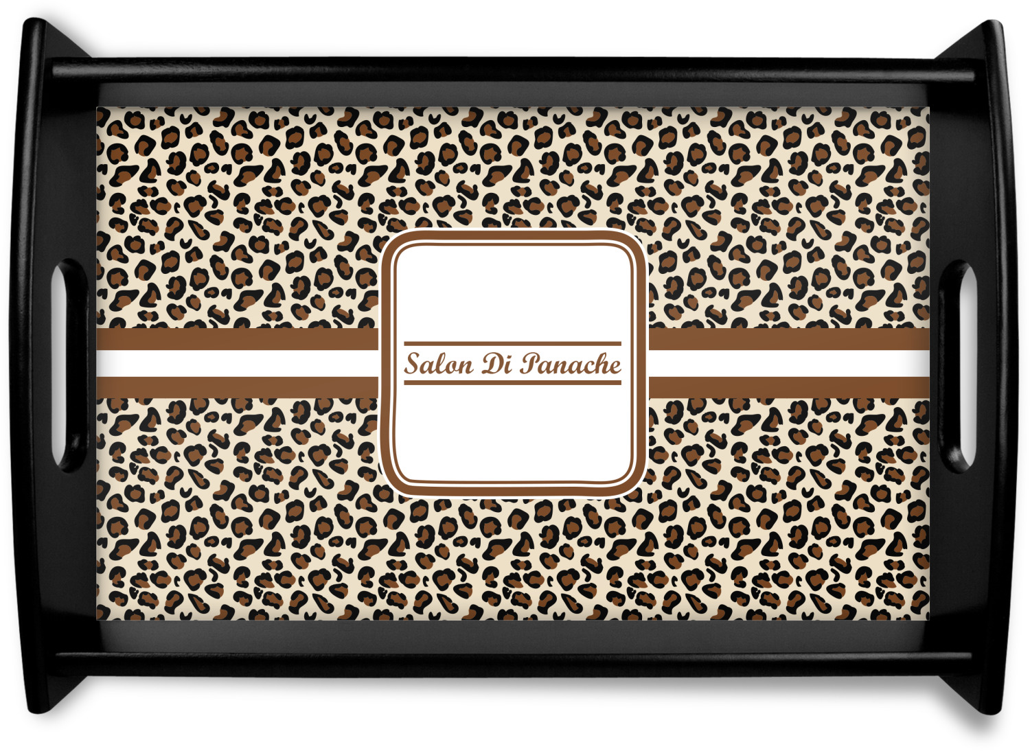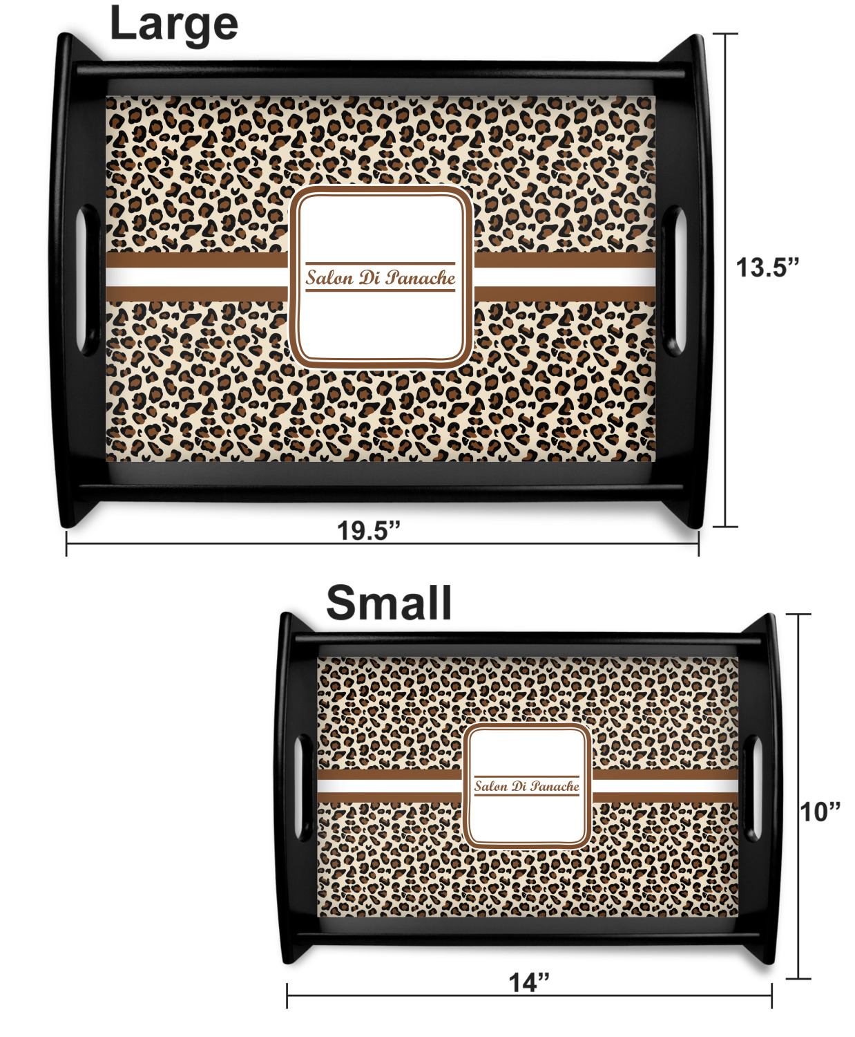 This serving tray with handles features square edges and two rounded sides, creating a very modern look. Each side is fabricated from a beautifully cut, natural wood. The bottom of the interior of the tray displays your customized design in bright, vibrant color. The tray is sold in both a black color and a natural wood look. Each variation of the wood serving tray has two sizes: Small, which is 14" x 10" x 2.25", and Large, which is 19.5" x 13.5" x 2.75".