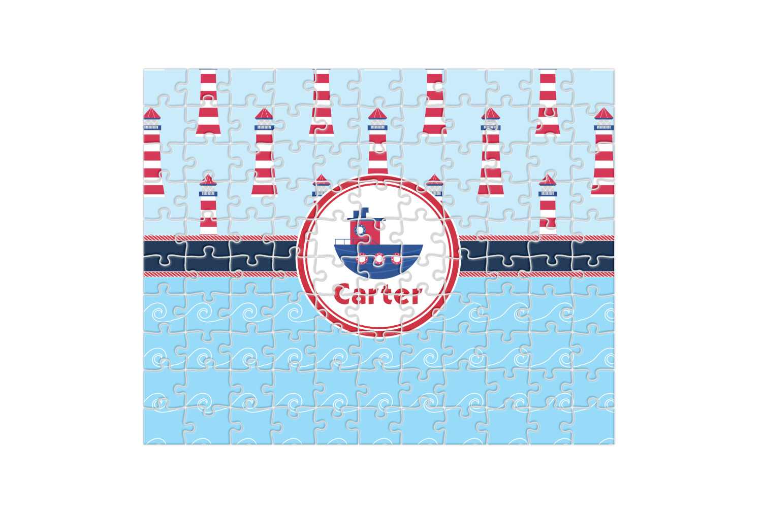 The center focal point of the design is a whimsical coordinating colored tugboat showcased in what looks like a ship's porthole with your personalized name under the tugboat.