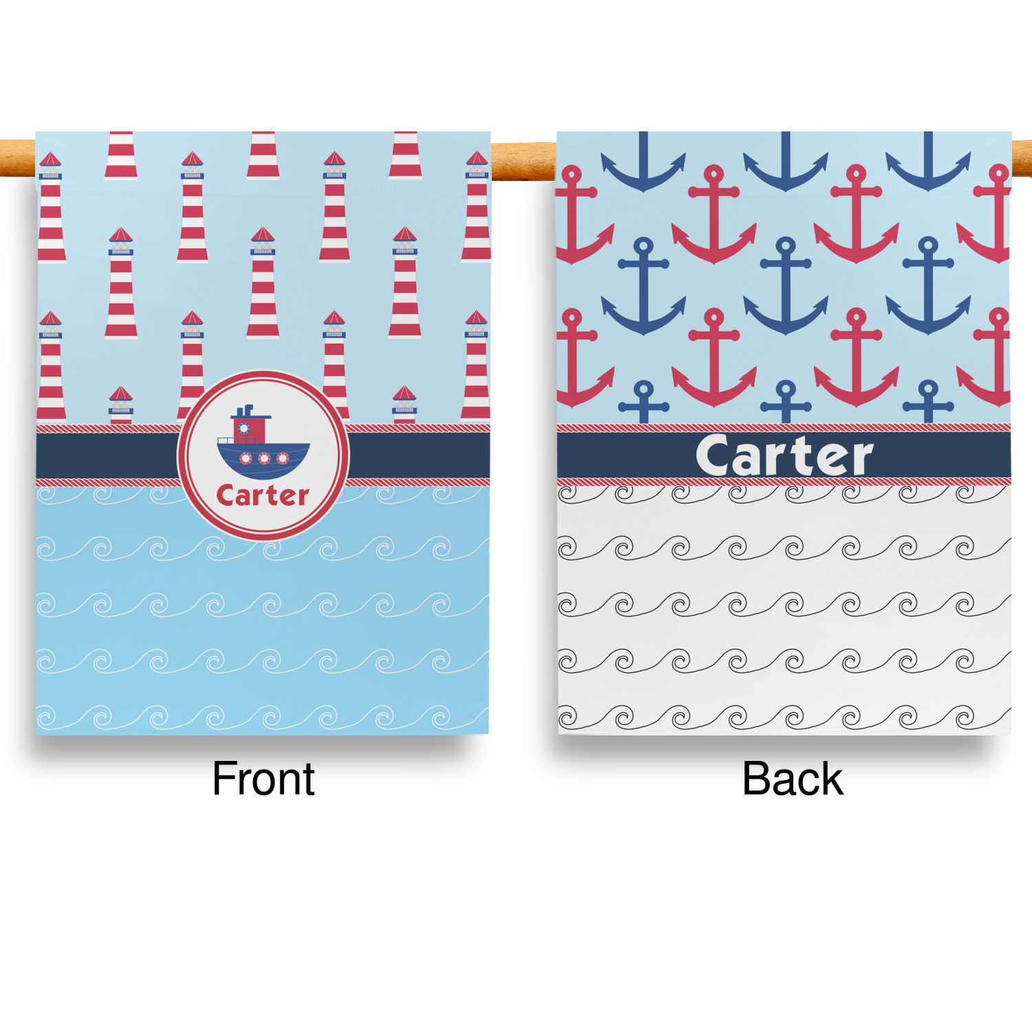 The center focal point of the design is a whimsical coordinating colored tugboat showcased in what looks like a ship's porthole with your personalized name under the tugboat.