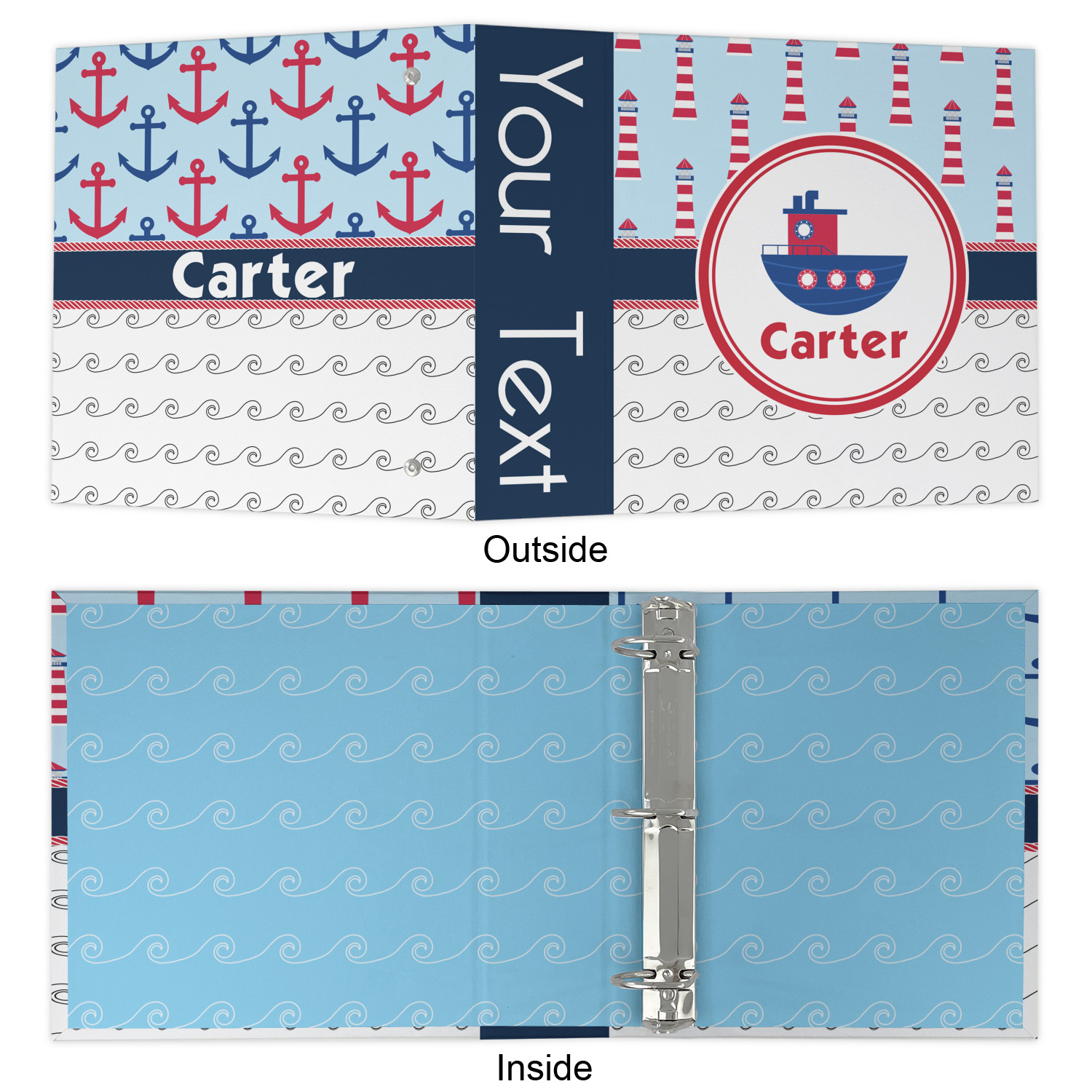 The center focal point of the design is a whimsical coordinating colored tugboat showcased in what looks like a ship's porthole with your personalized name under the tugboat.