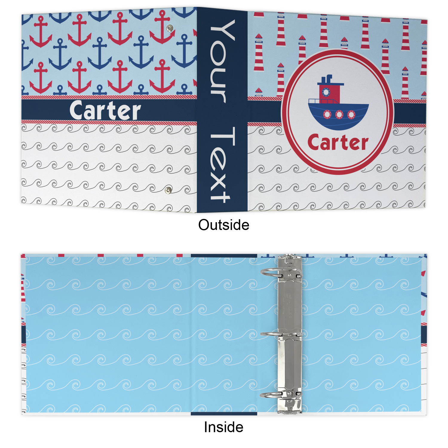 The center focal point of the design is a whimsical coordinating colored tugboat showcased in what looks like a ship's porthole with your personalized name under the tugboat.