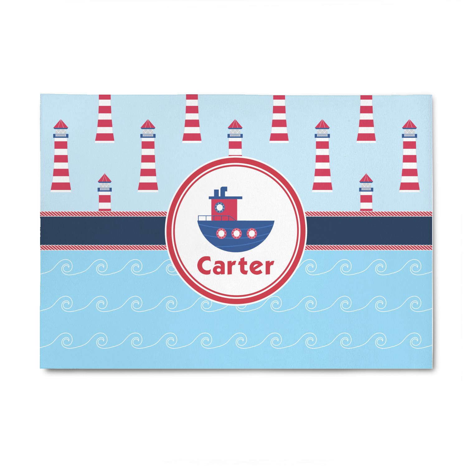 The center focal point of the design is a whimsical coordinating colored tugboat showcased in what looks like a ship's porthole with your personalized name under the tugboat.
