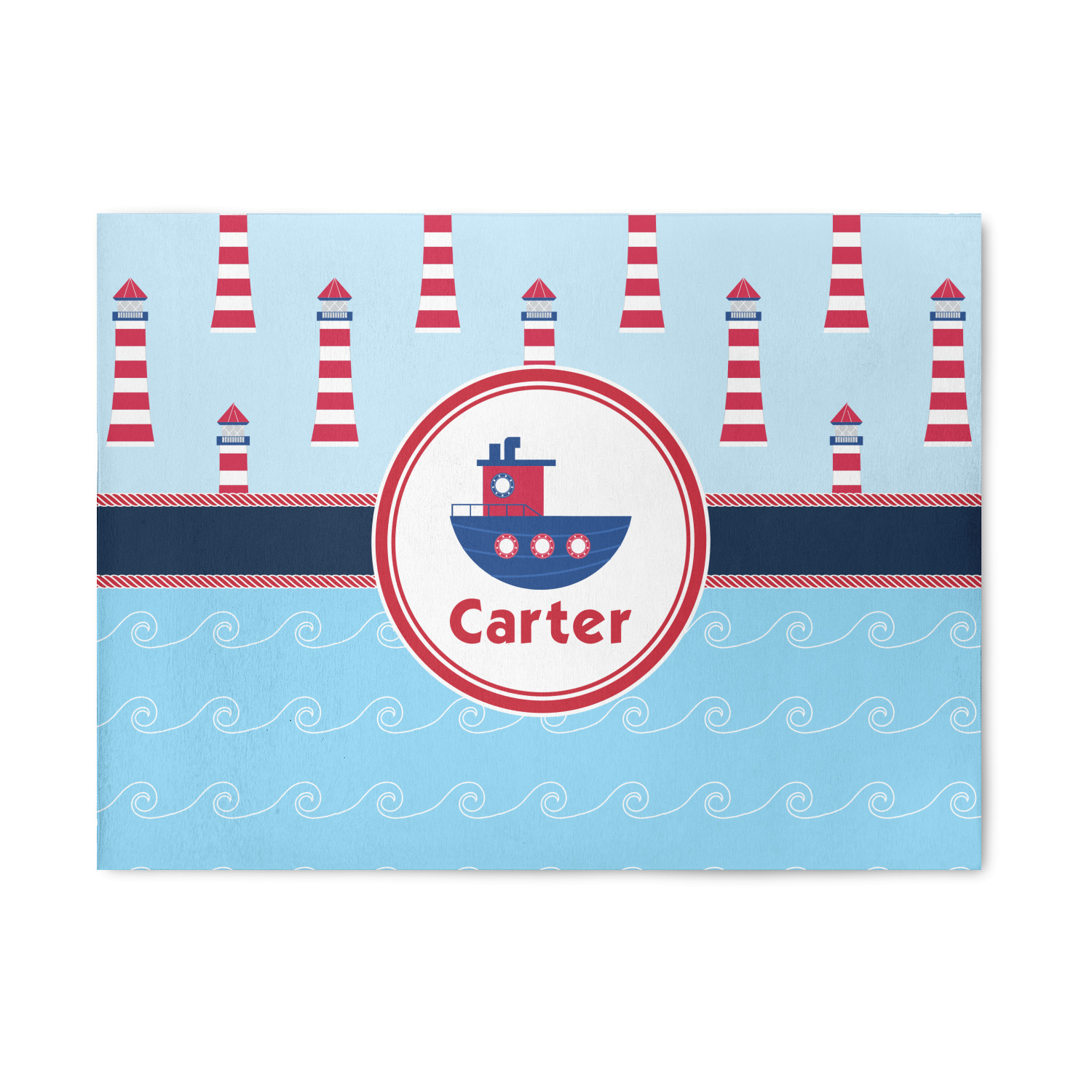 The center focal point of the design is a whimsical coordinating colored tugboat showcased in what looks like a ship's porthole with your personalized name under the tugboat.