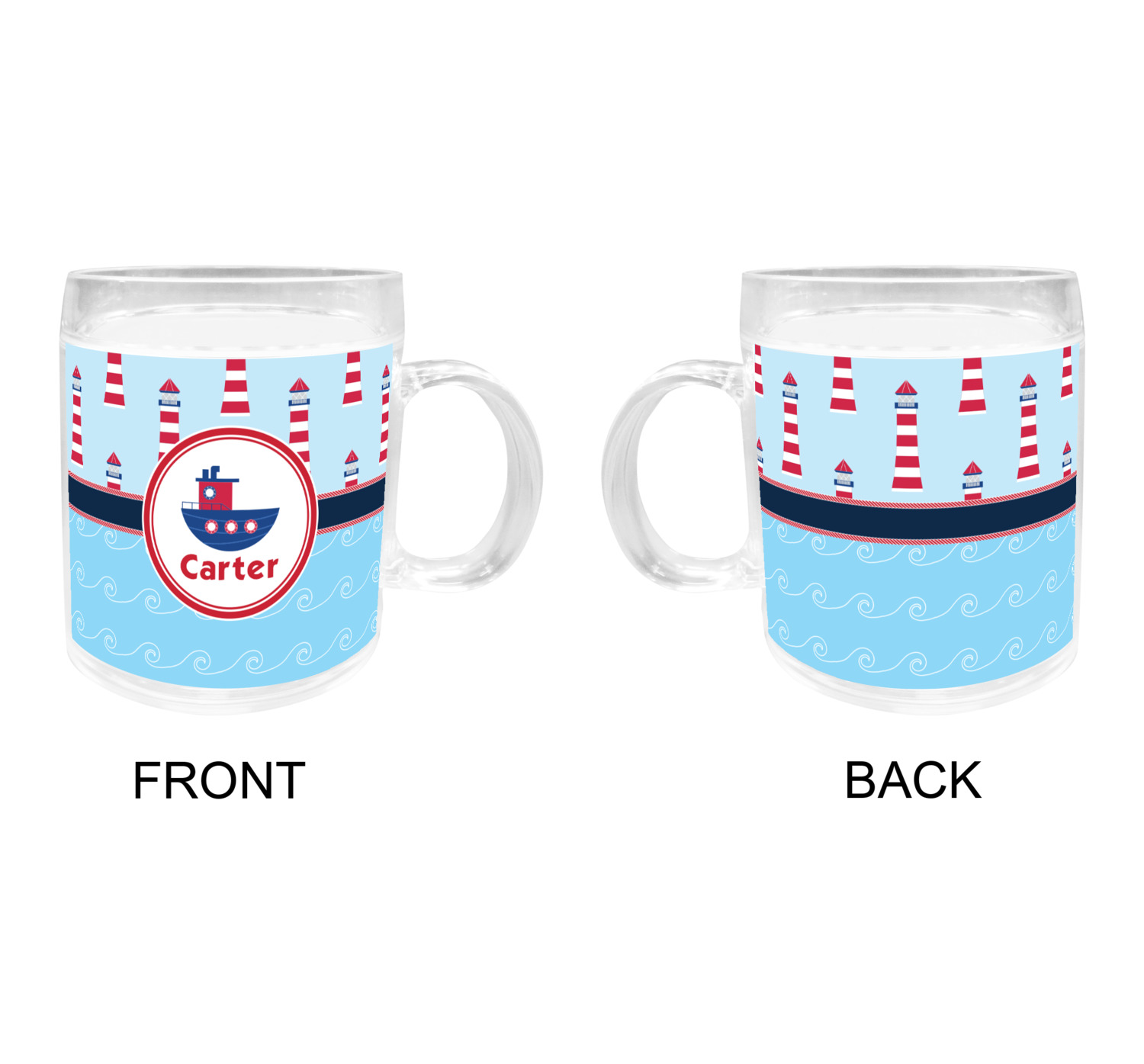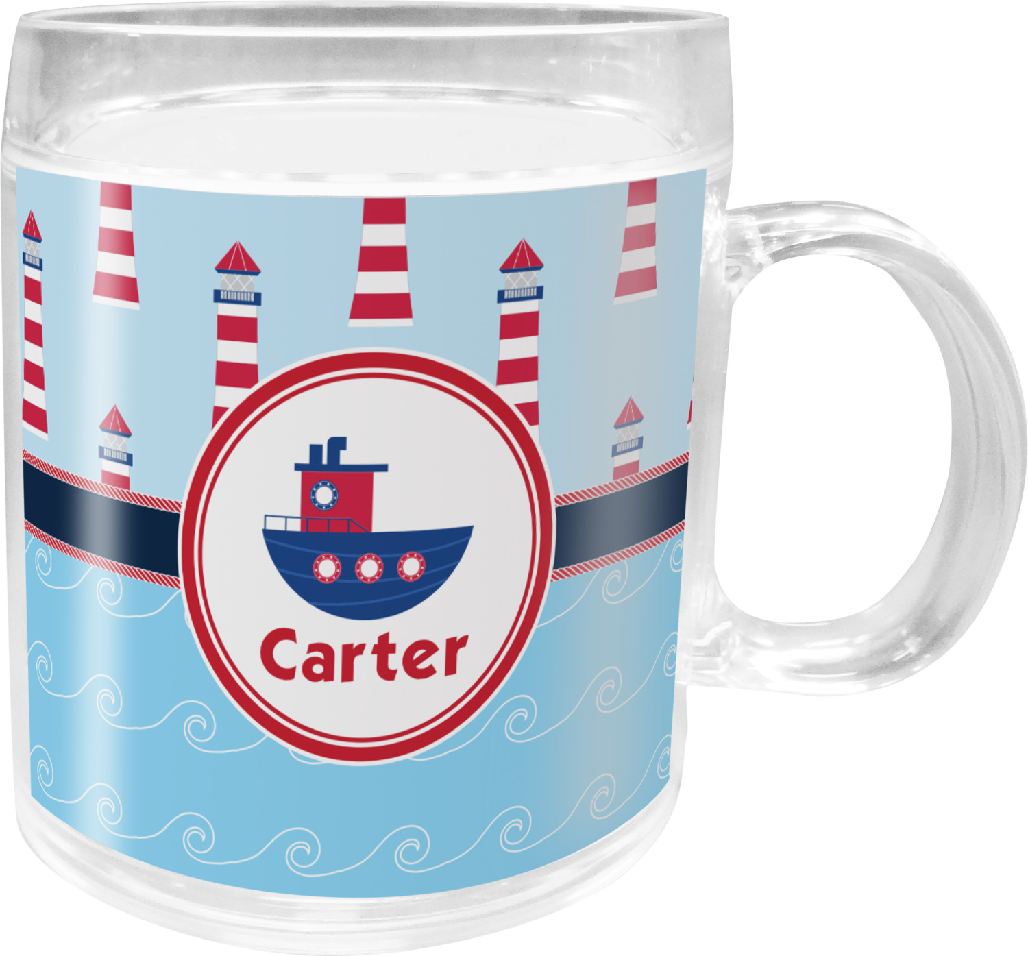 The center focal point of the design is a whimsical coordinating colored tugboat showcased in what looks like a ship's porthole with your personalized name under the tugboat.