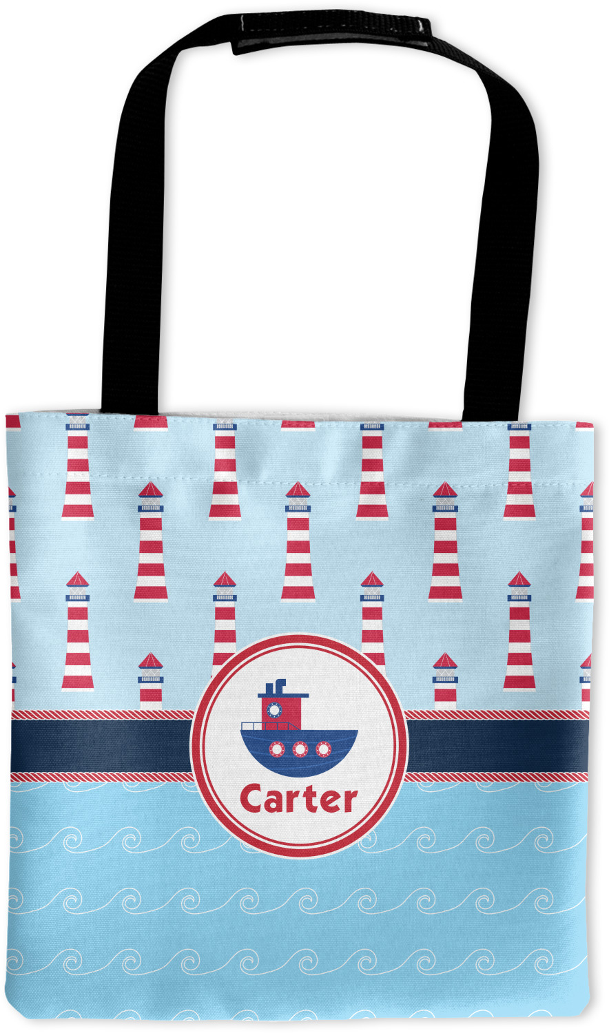 The center focal point of the design is a whimsical coordinating colored tugboat showcased in what looks like a ship's porthole with your personalized name under the tugboat.