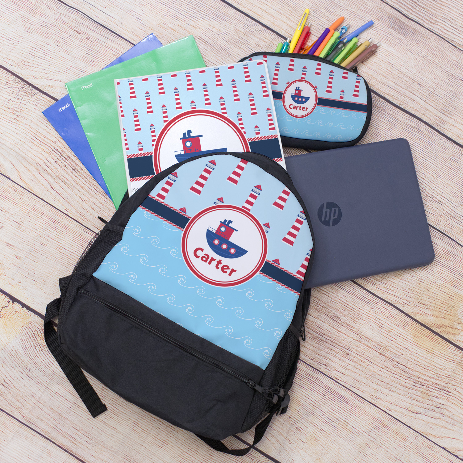 The center focal point of the design is a whimsical coordinating colored tugboat showcased in what looks like a ship's porthole with your personalized name under the tugboat.