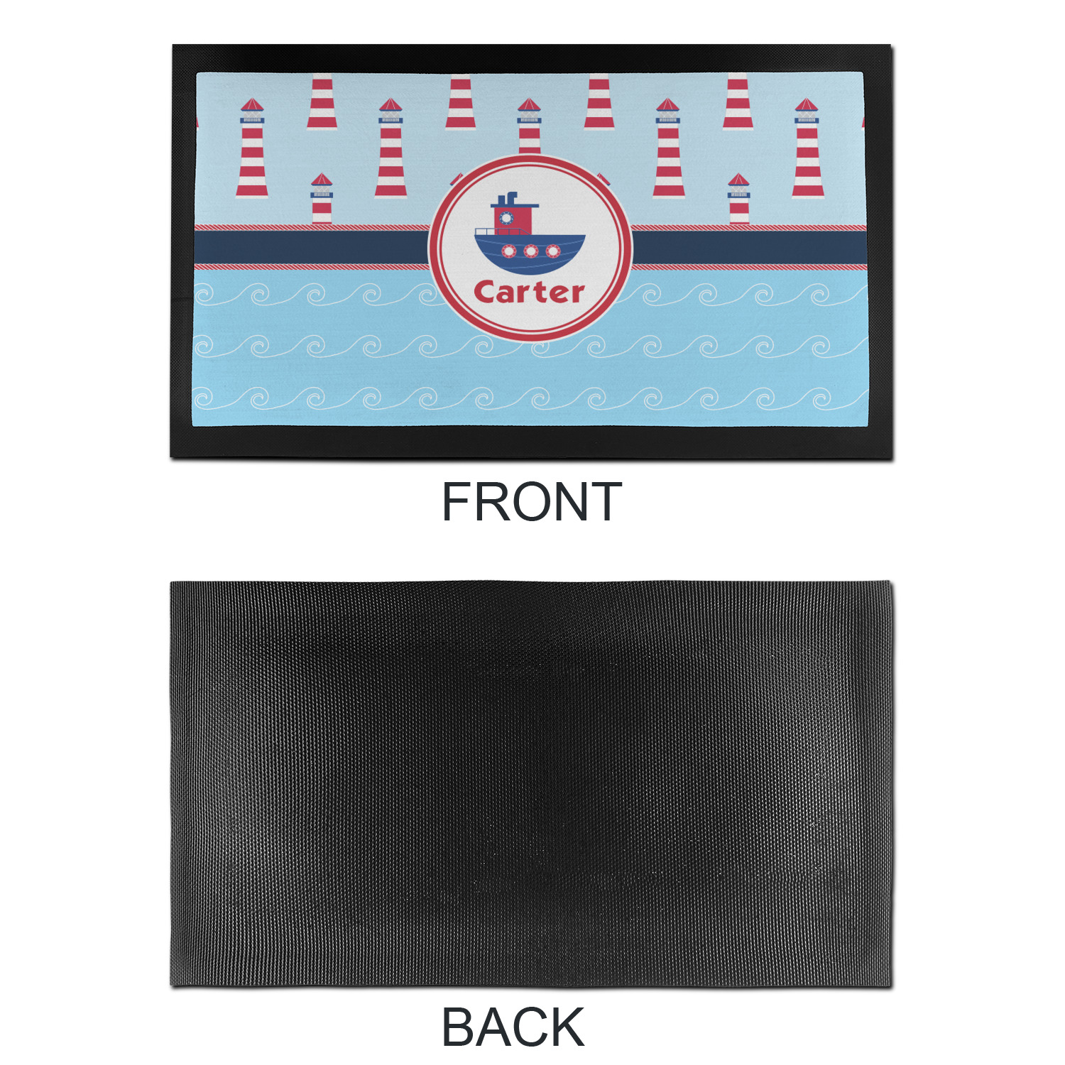 The center focal point of the design is a whimsical coordinating colored tugboat showcased in what looks like a ship's porthole with your personalized name under the tugboat.