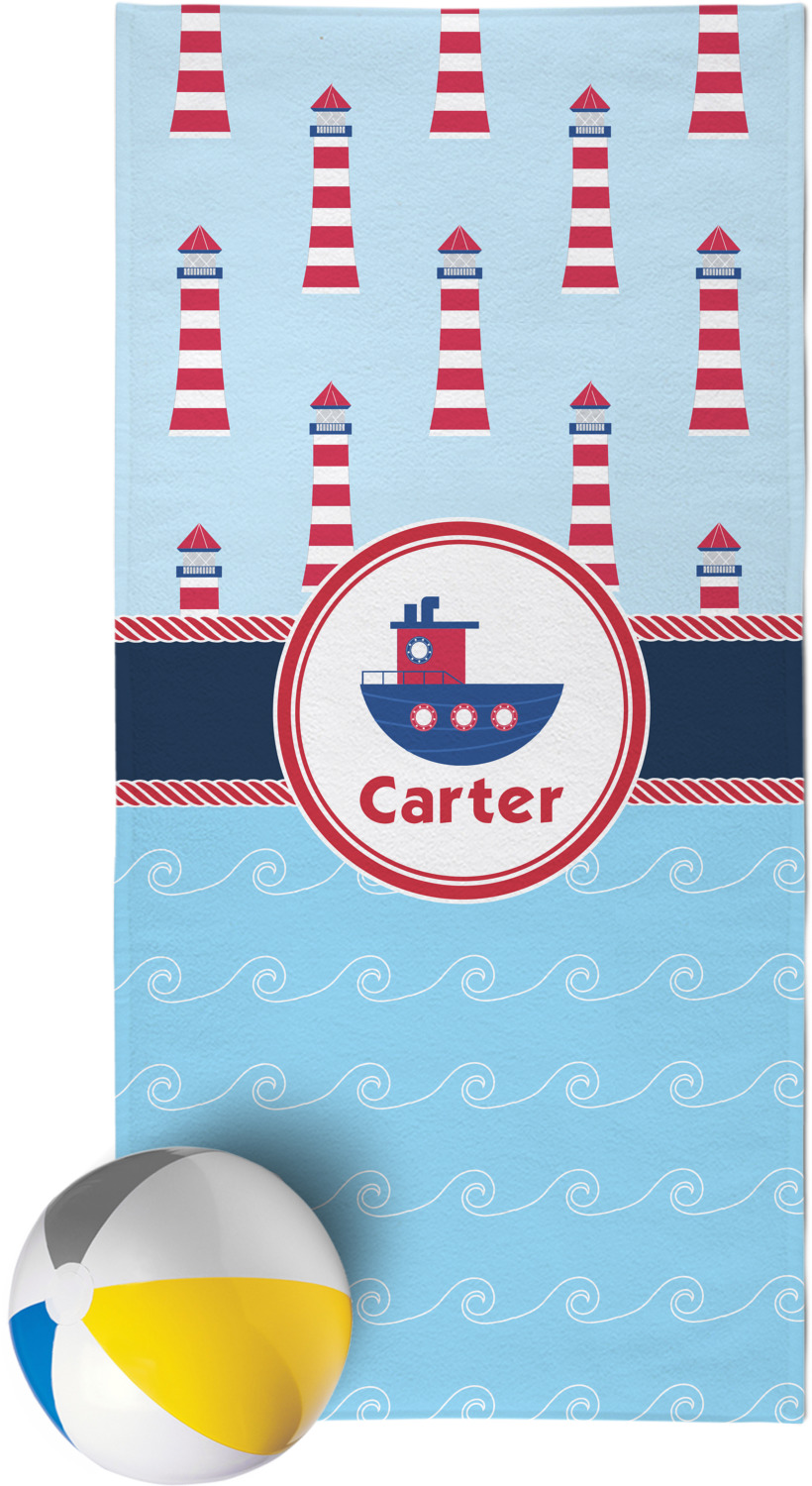 The center focal point of the design is a whimsical coordinating colored tugboat showcased in what looks like a ship's porthole with your personalized name under the tugboat.
