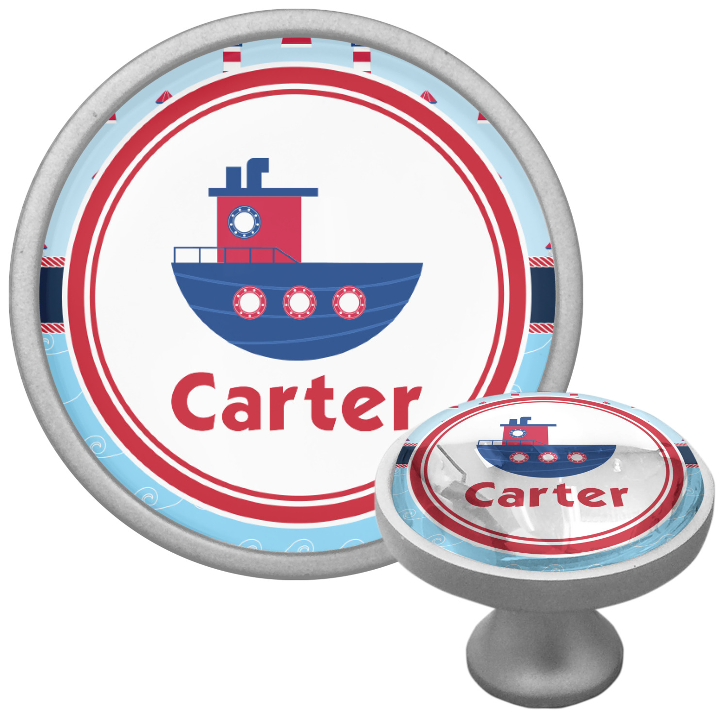 The center focal point of the design is a whimsical coordinating colored tugboat showcased in what looks like a ship's porthole with your personalized name under the tugboat.