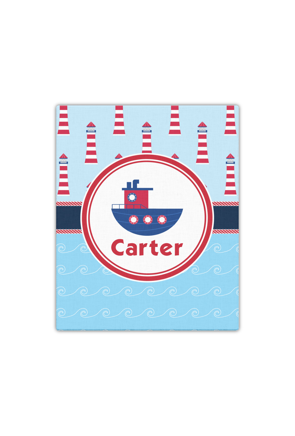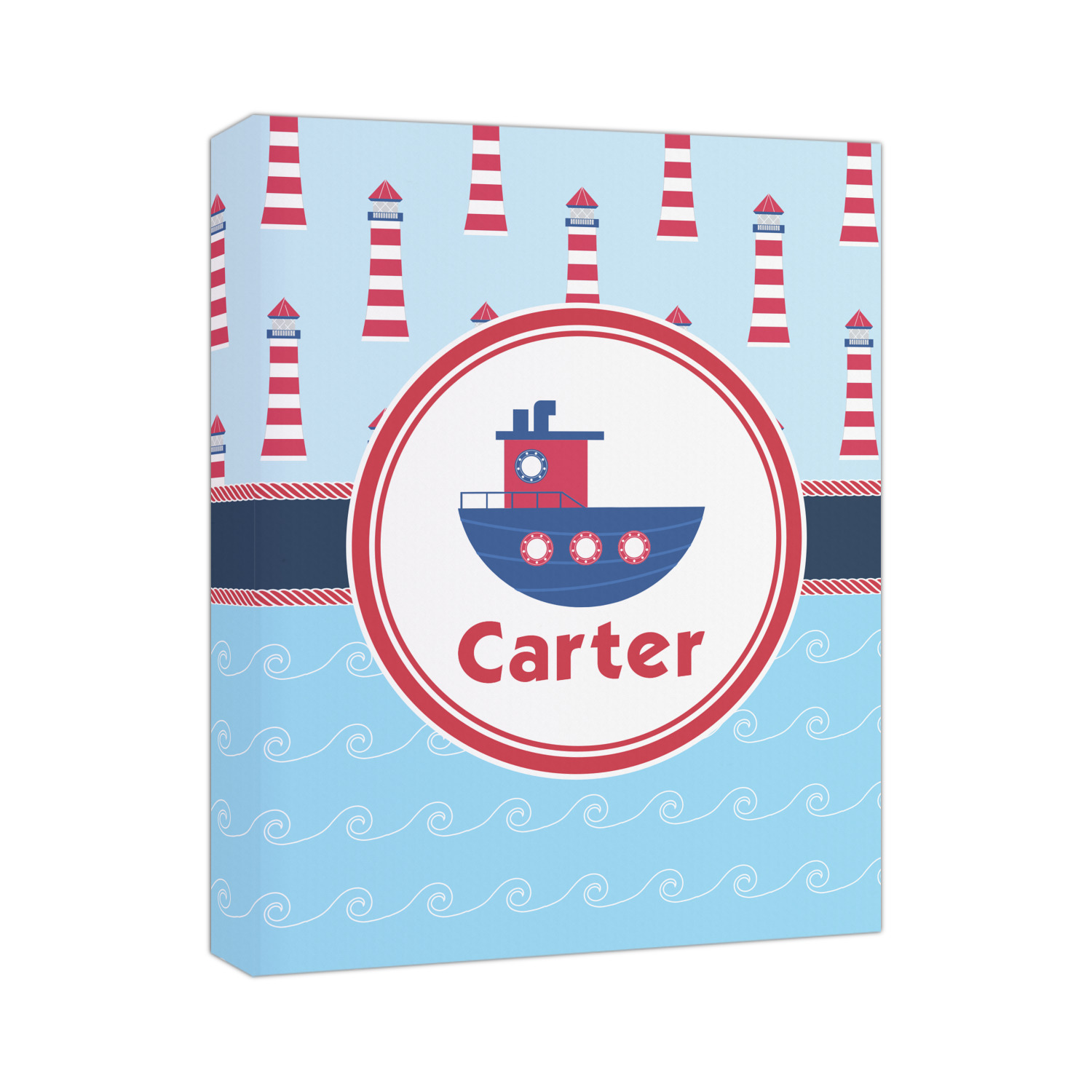 The center focal point of the design is a whimsical coordinating colored tugboat showcased in what looks like a ship's porthole with your personalized name under the tugboat.