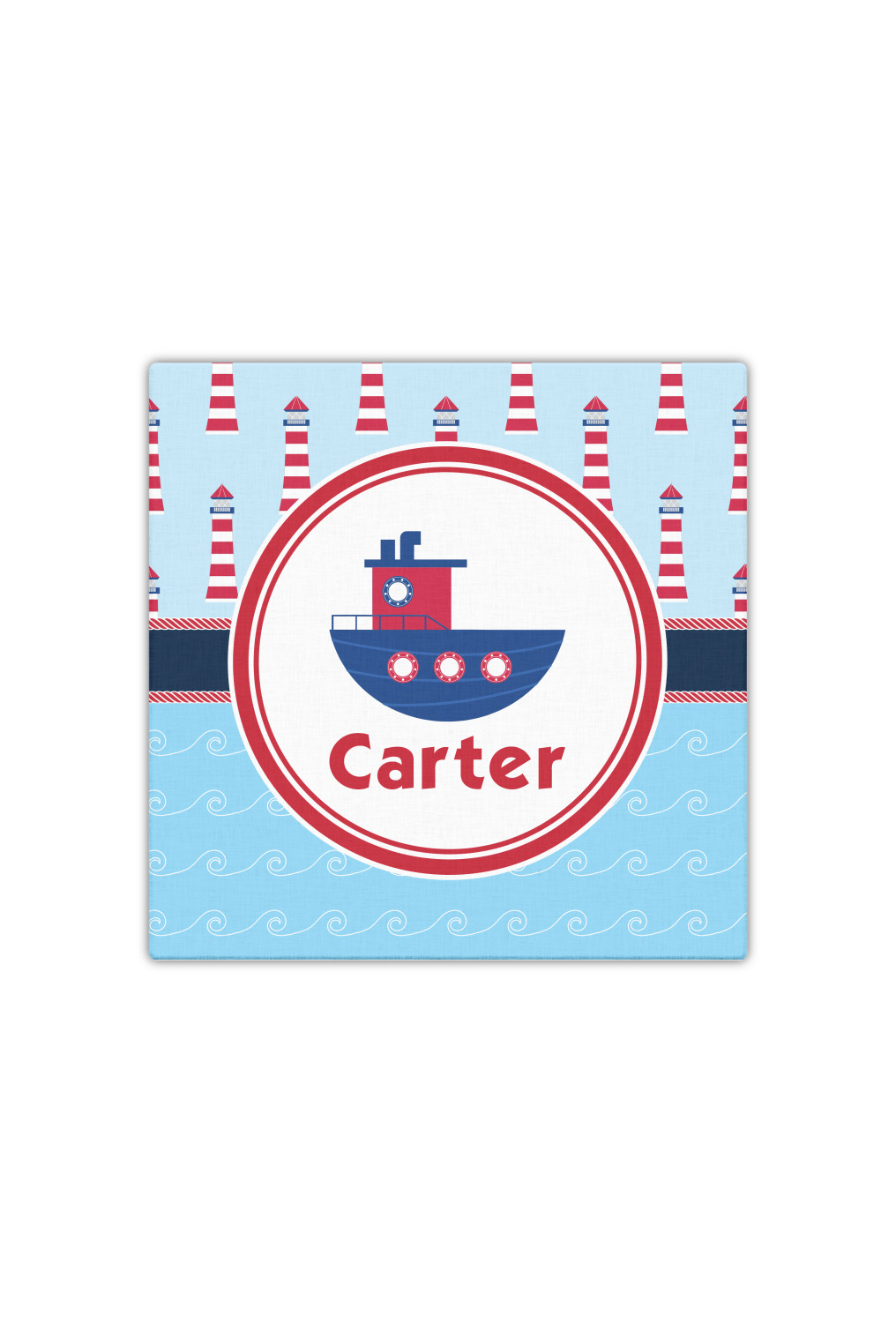 The center focal point of the design is a whimsical coordinating colored tugboat showcased in what looks like a ship's porthole with your personalized name under the tugboat.